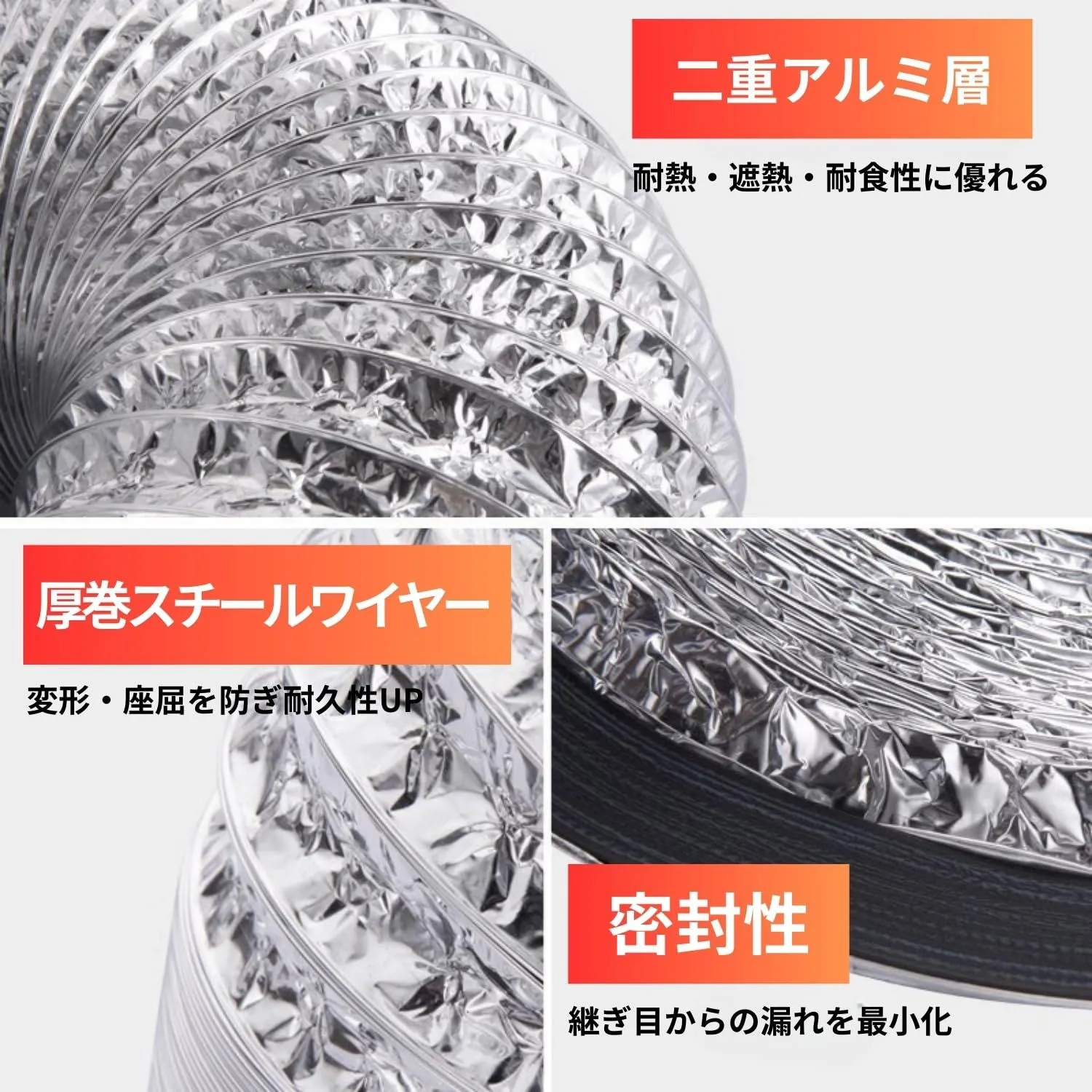 【二重アルミ+強化ワイヤー】耐熱・耐食性に優れ、潰れにくく密閉性も高い長寿命構造。