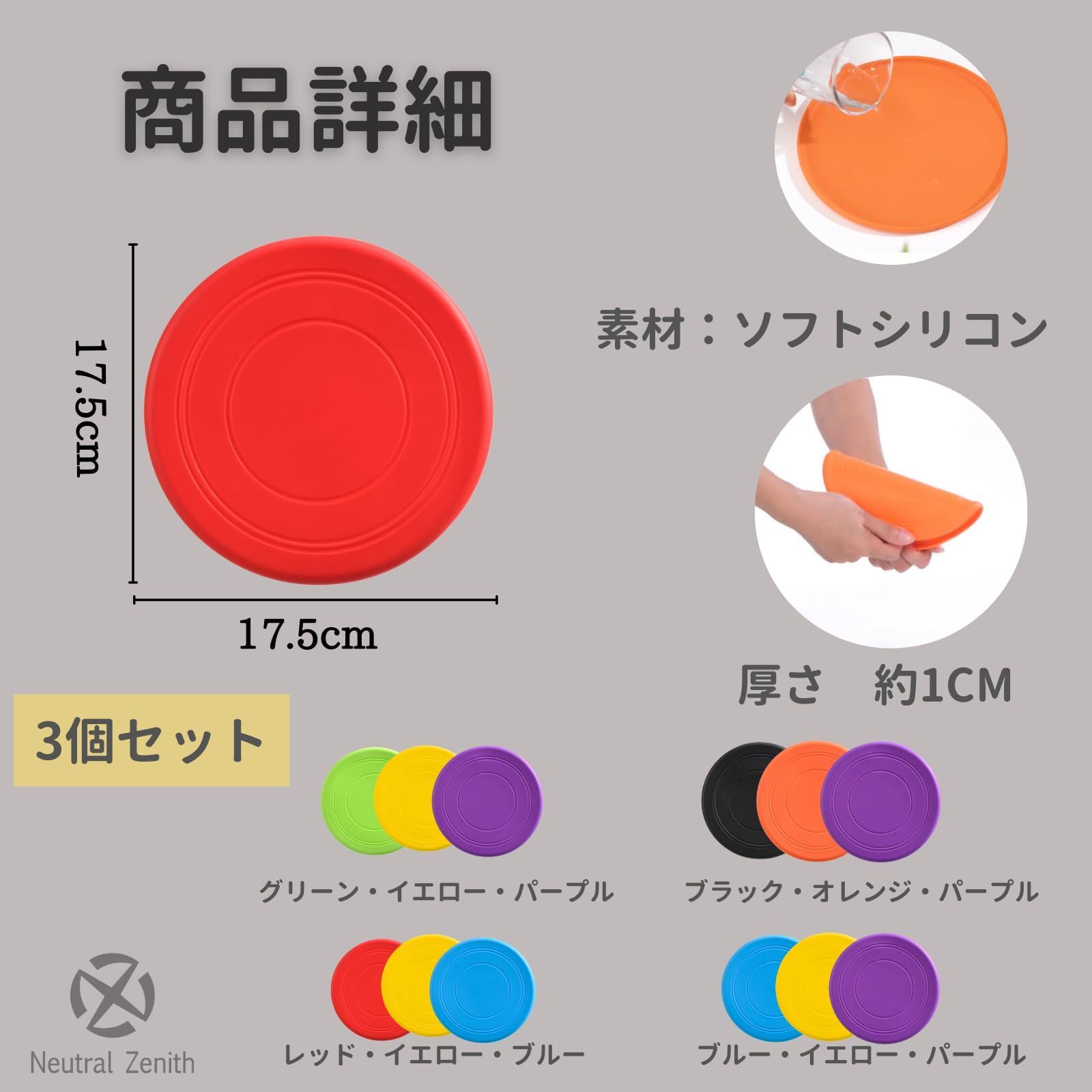 【商品詳細】サイズ:17.5 × 17.5cm 厚さ:約1cm 素材:ソフトシリコン セット:3個 カラー:レッド・イエロー・ブルー / グリーン・イエロー・パープル / ブラック・オレンジ・パープル / ブルー・イエロー・パープル