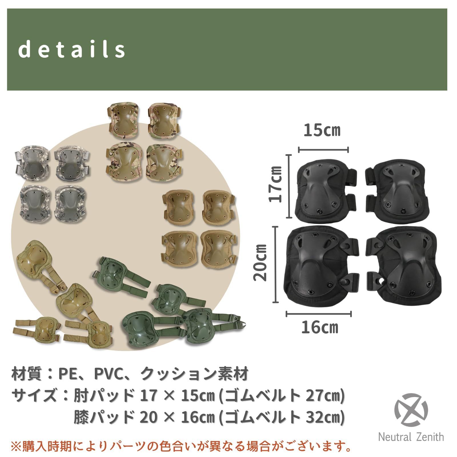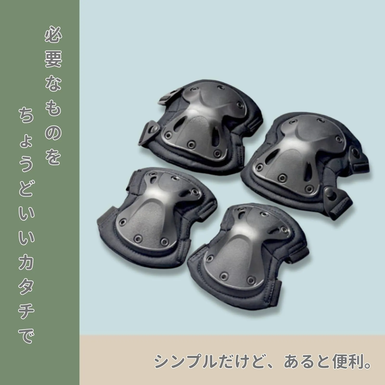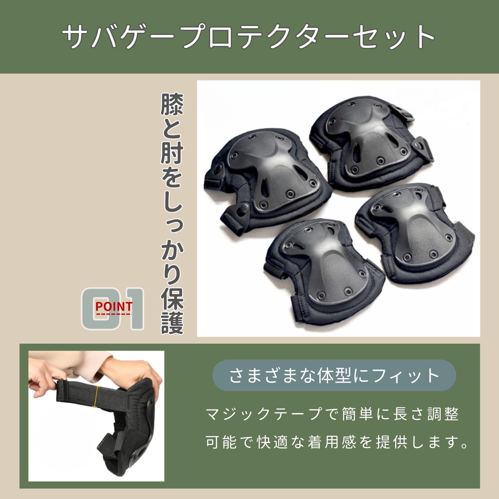 【サバゲープロテクターセット】マジックテープで簡単に長さ調整が可能なプロテクターセットです。大人からティーンまで、さまざまな体型にフィットし、快適な着用感を提供します。