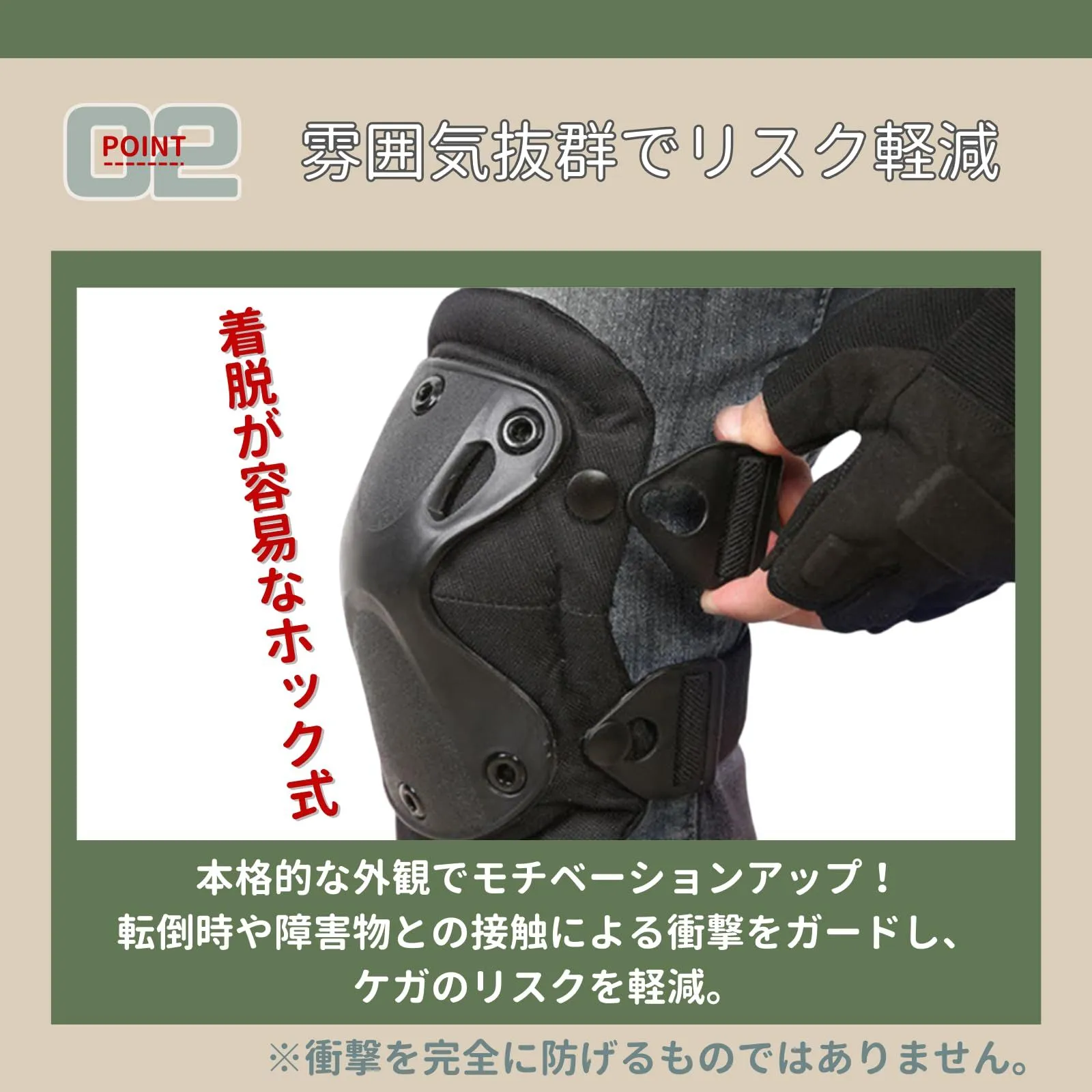 【高い耐衝撃性】強度の高い素材を使用し、膝や肘をしっかりガード。転倒時や障害物との接触による衝撃を吸収し、ケガのリスクを軽減します。軽量設計で長時間の装着でも負担になりにくく、機動力を損ないません。