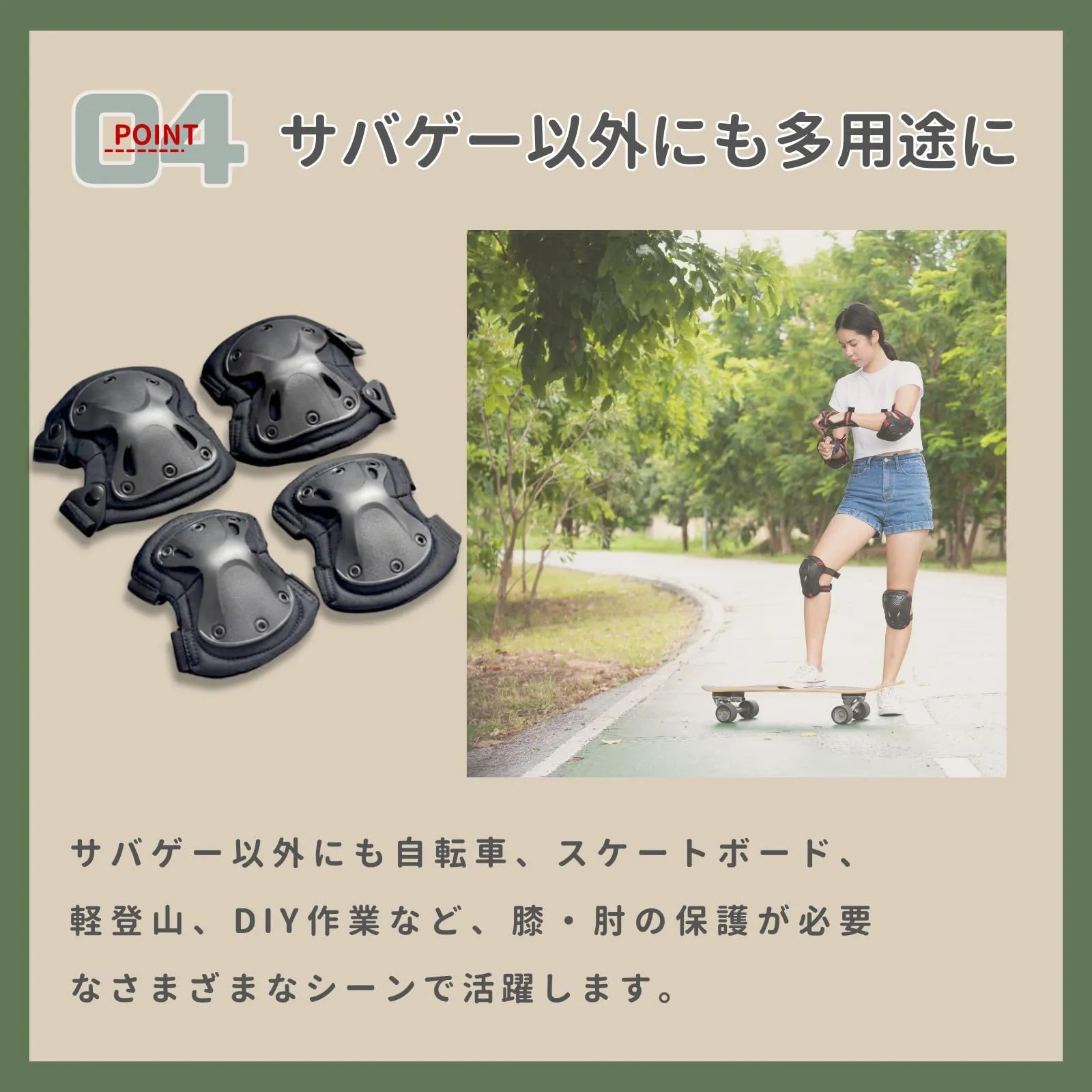 【多用途に対応】サバゲー以外にも、バイク、スケートボード、登山、DIY作業など、膝・肘の保護が必要なさまざまなシーンで活躍します。