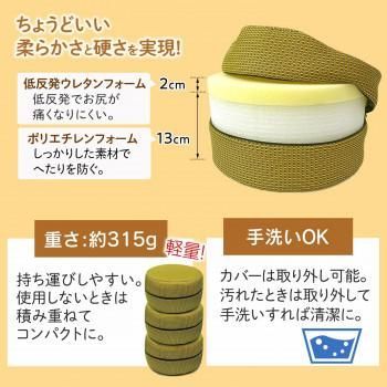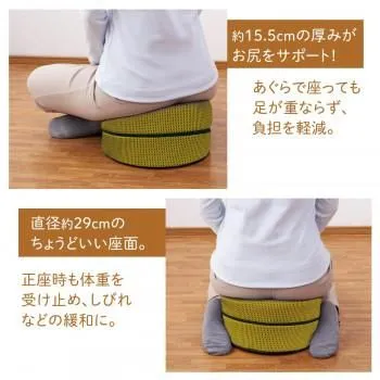正座やあぐらで床に座るとき、足や腰などへの負担を軽減して楽に座れるクッションです。滑り止めつきで立ち座りしやすく、お年寄りの方や、お子様の座椅子としてもオススメです。