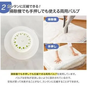 手押しでも掃除機でも使える大容量のふとん圧縮袋。片マチ立体設計でたっぷり収納できます。手押しでも掃除機でも使える便利な両用バルブになっています。ファスナーがマチ側についているので、ふとんを入れた後にファスナーが閉めやすい!Mサイズ・2枚組