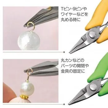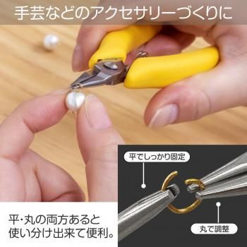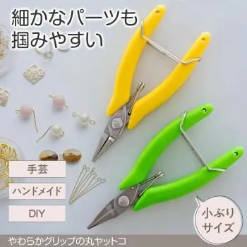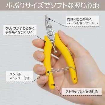 パーツ修理やアクセサリーづくりに便利なヤットコ。小ぶりなサイズでソフトな握り心地。内側に凸凹が無くパーツを傷つけにくい。ハンドルストッパー付きで収納しやすく、ストラップなどを通せる穴付き。