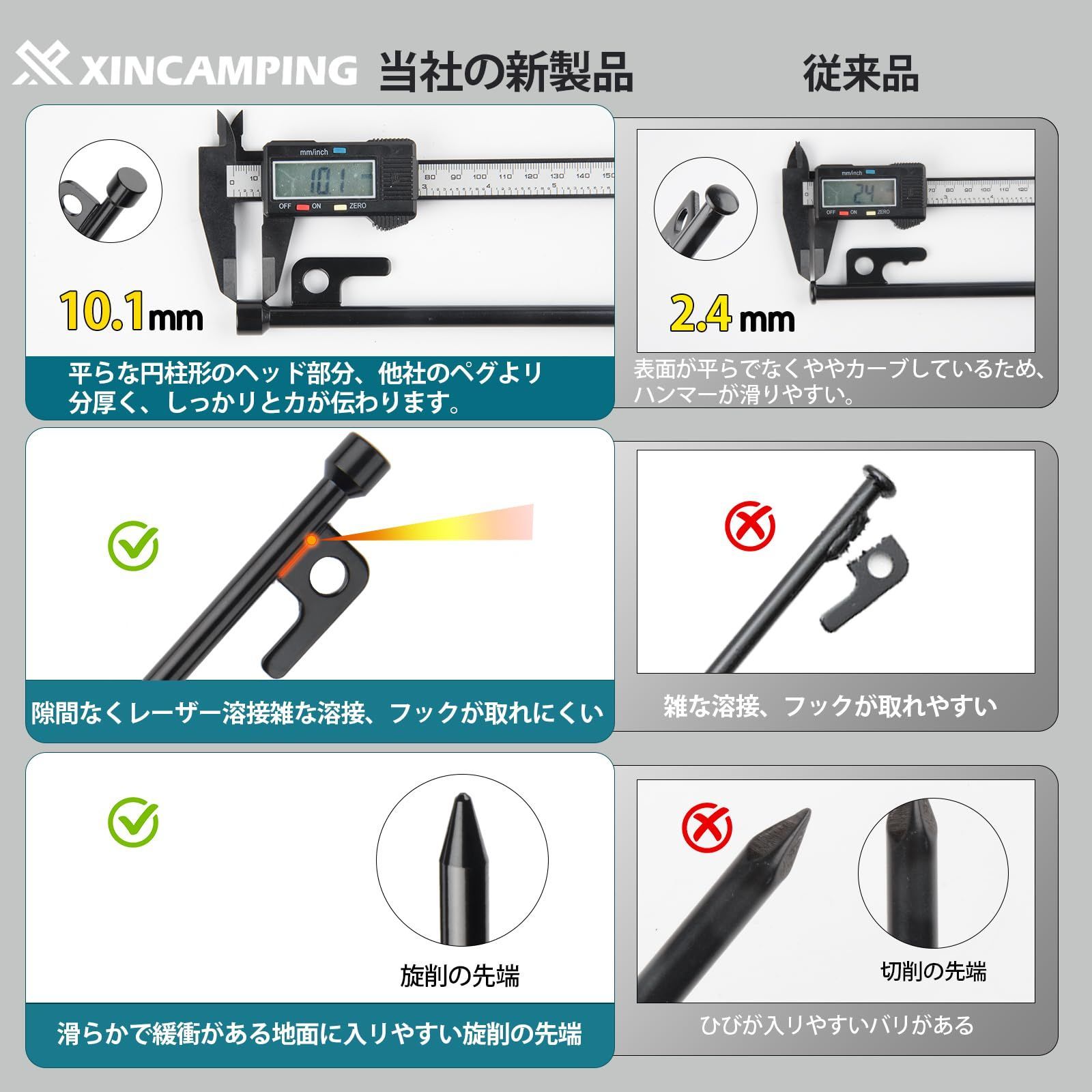 ペグ Xincamping 鍛造ペグ 28cm 20cm スチール 8本/16本 レーザー溶接 反射材入りロープ ソリッドステーク 電着塗装 キャンプ テント タープ キャンプ設営用具 収納袋なし キャップ付き 砂利 硬い土 砂浜 草地用等対応(28cm)