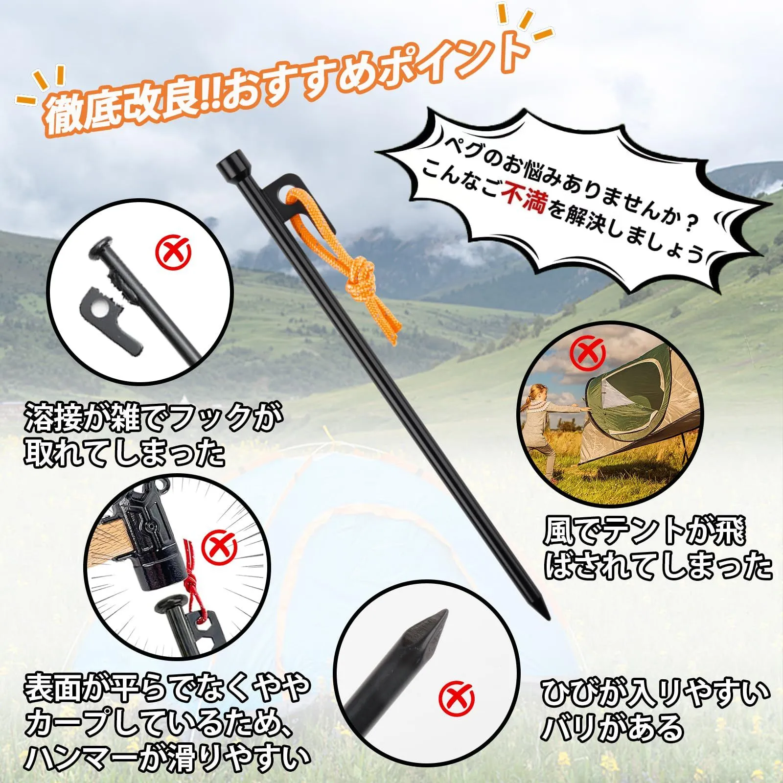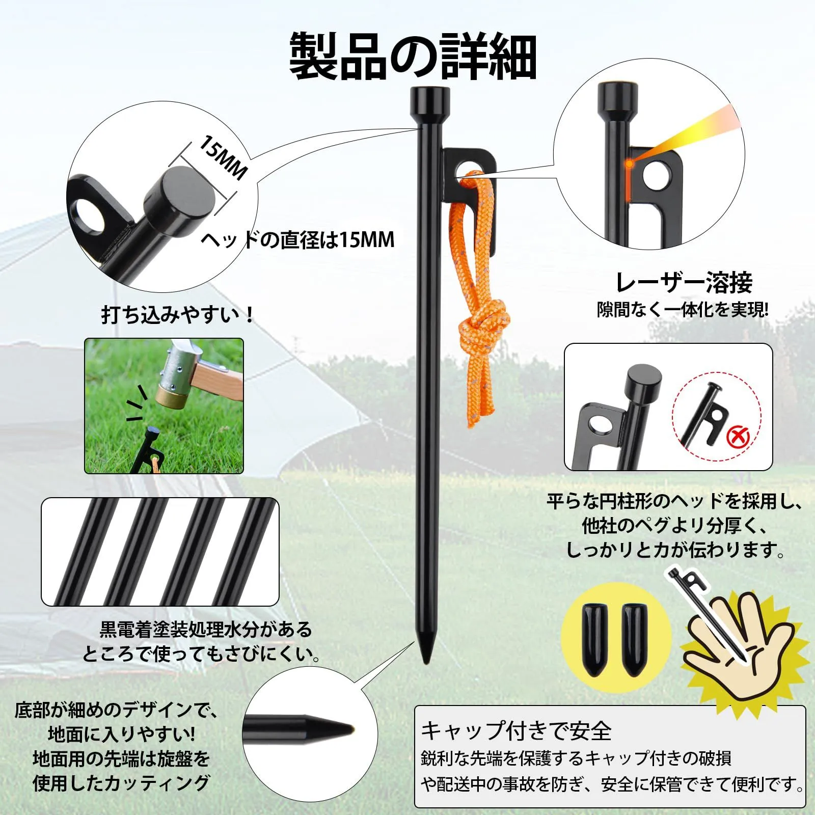 【細部までこだわりのペグ】:ペグの打撃面の幅が15mm程度あるものは狙いを定めやすく打ち込みやすい、直径9mmの太さがあり、打ち込み時にペグが曲がってしまうという心配もなく、ガッチリ固定するのに最適な強度を持っています。打撃時にハンマーが滑りにくく、打撃力を確実にボディに伝えます