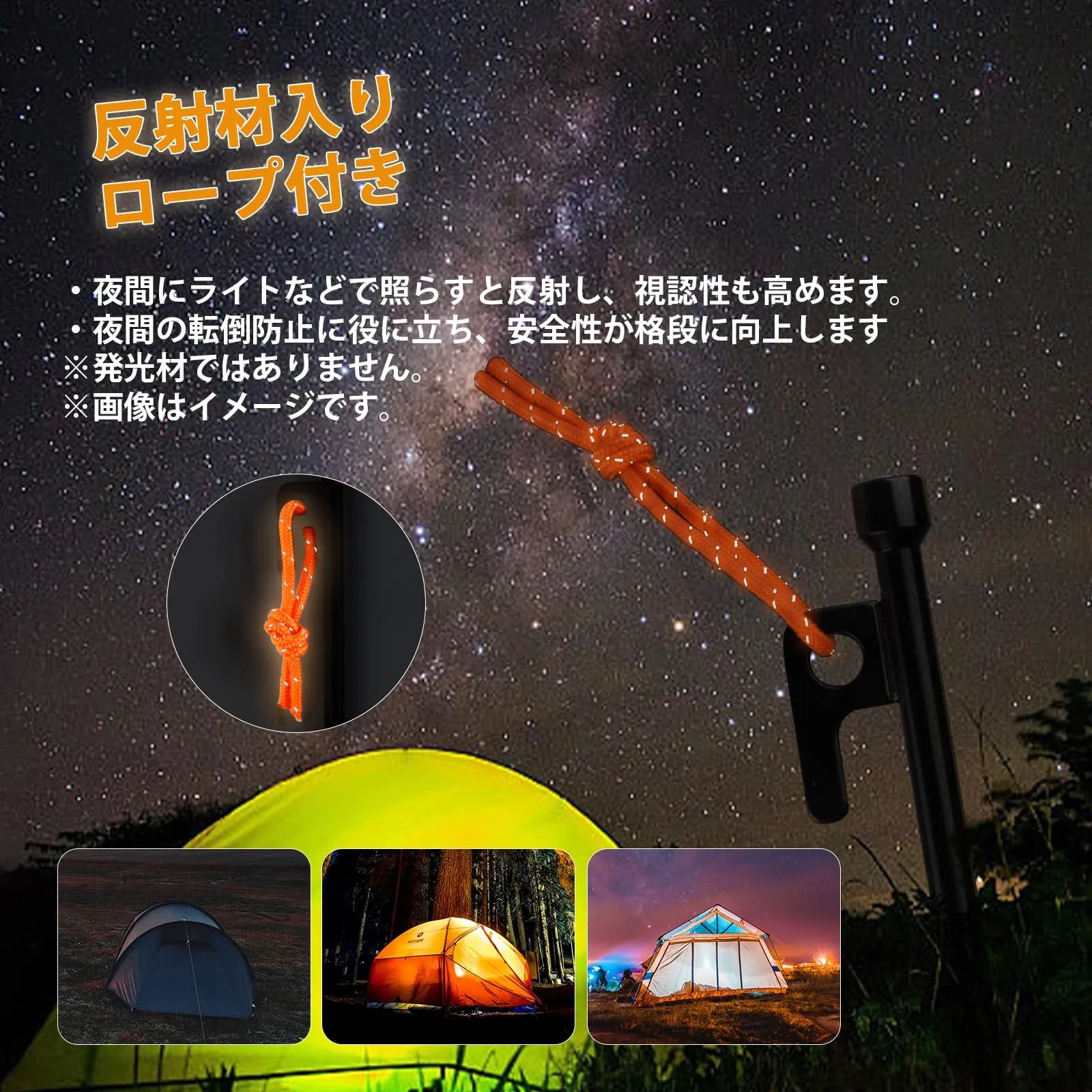 【反射材テントロープ付き】:蛍光色ロープに反射材を編みこんだリフレクティブロープつけて、真っ暗なところでぼんやり光り、光が当たればキラキラする反射材入り、 キャンプ中の事故防止に!ペグ回収が簡単になります。(ヒント:照明がない限り、ロープは反射しません。)