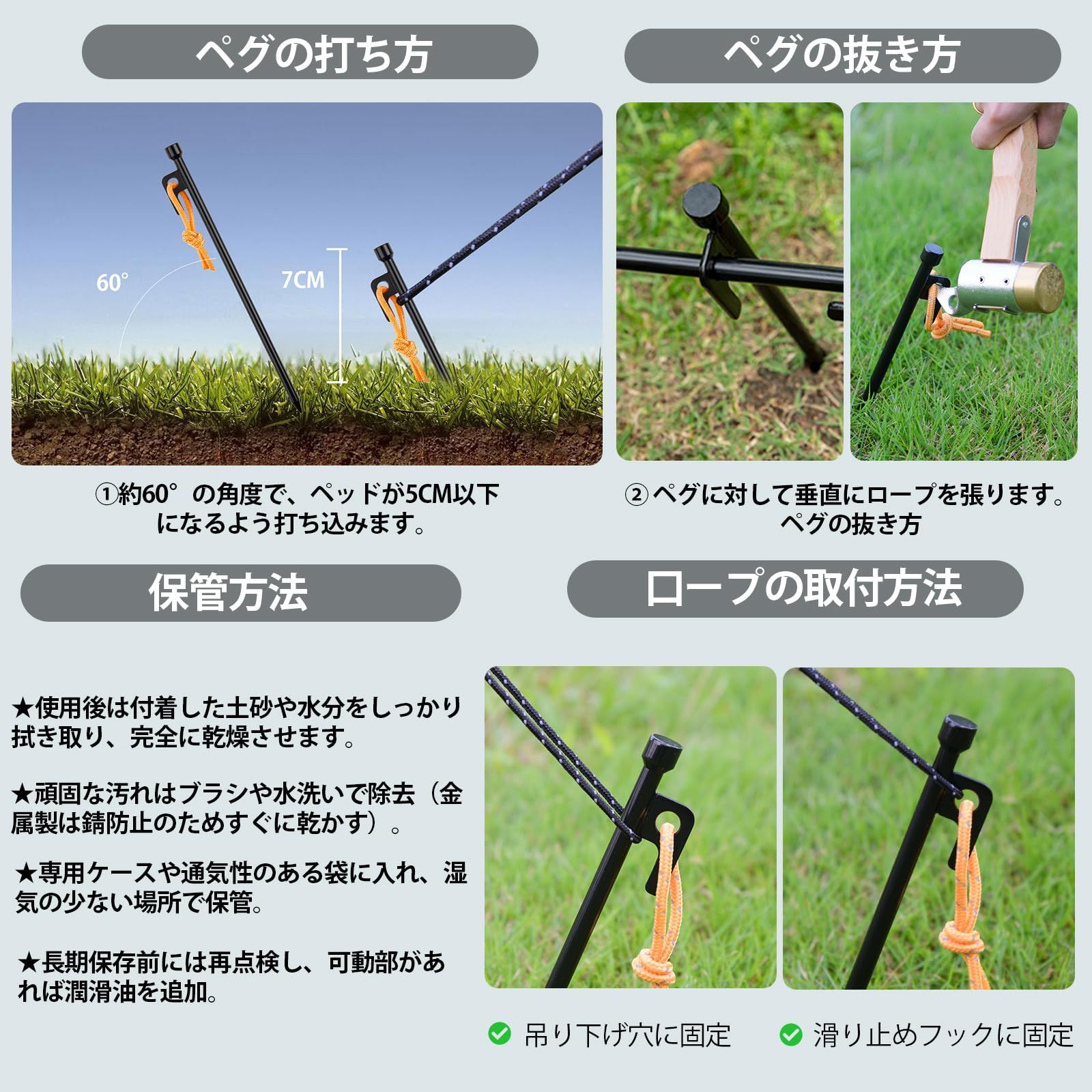 【丈夫な材質】:高炭素鋼製のテントペグが8本付き、頑丈で折れにくい。砂利や石が混じった固い地面でも入り込みが良く、ガッチリと固定します。ペグ表面は黒電着塗装処理を施すことにより、高い防サビ性と耐久性を兼ね揃えております。