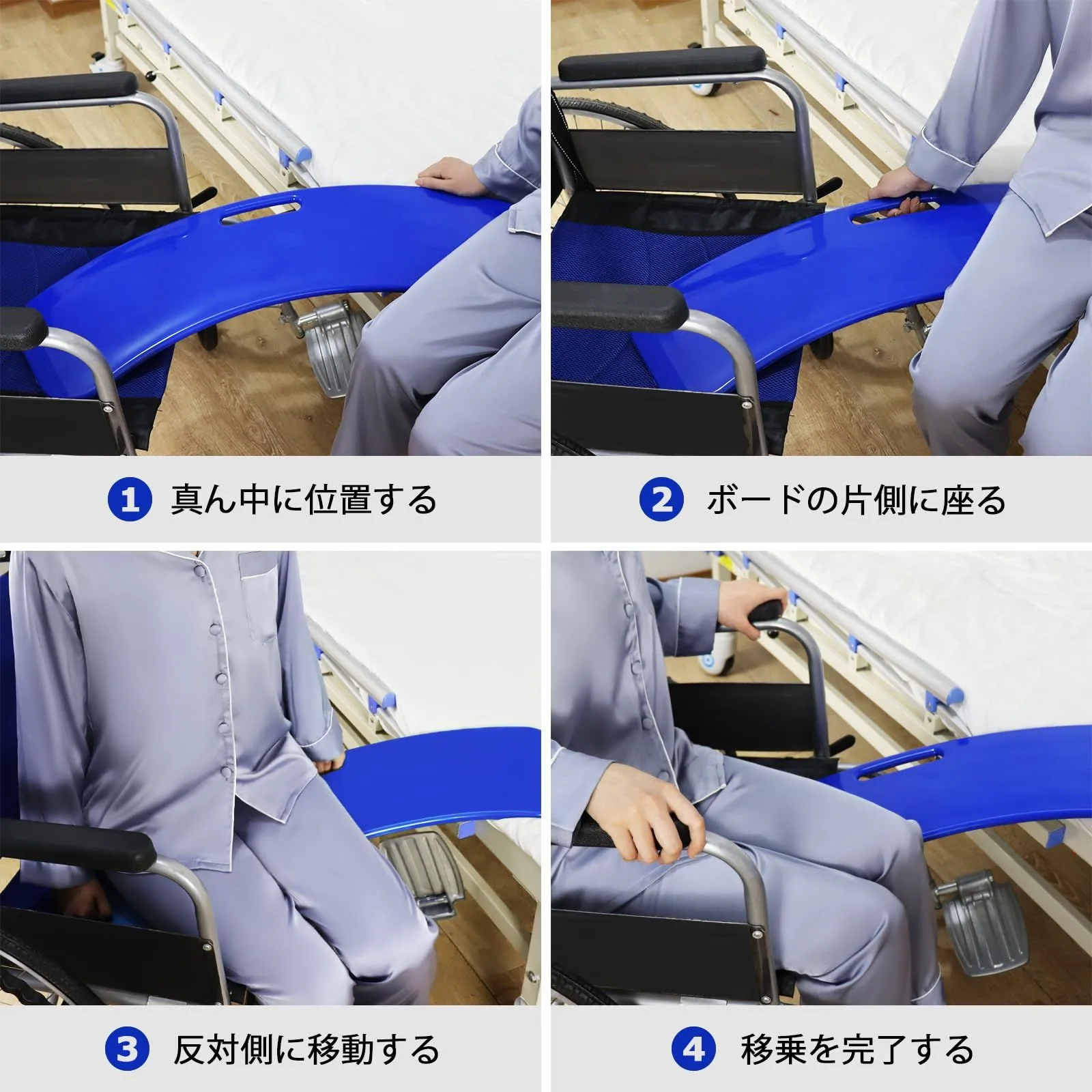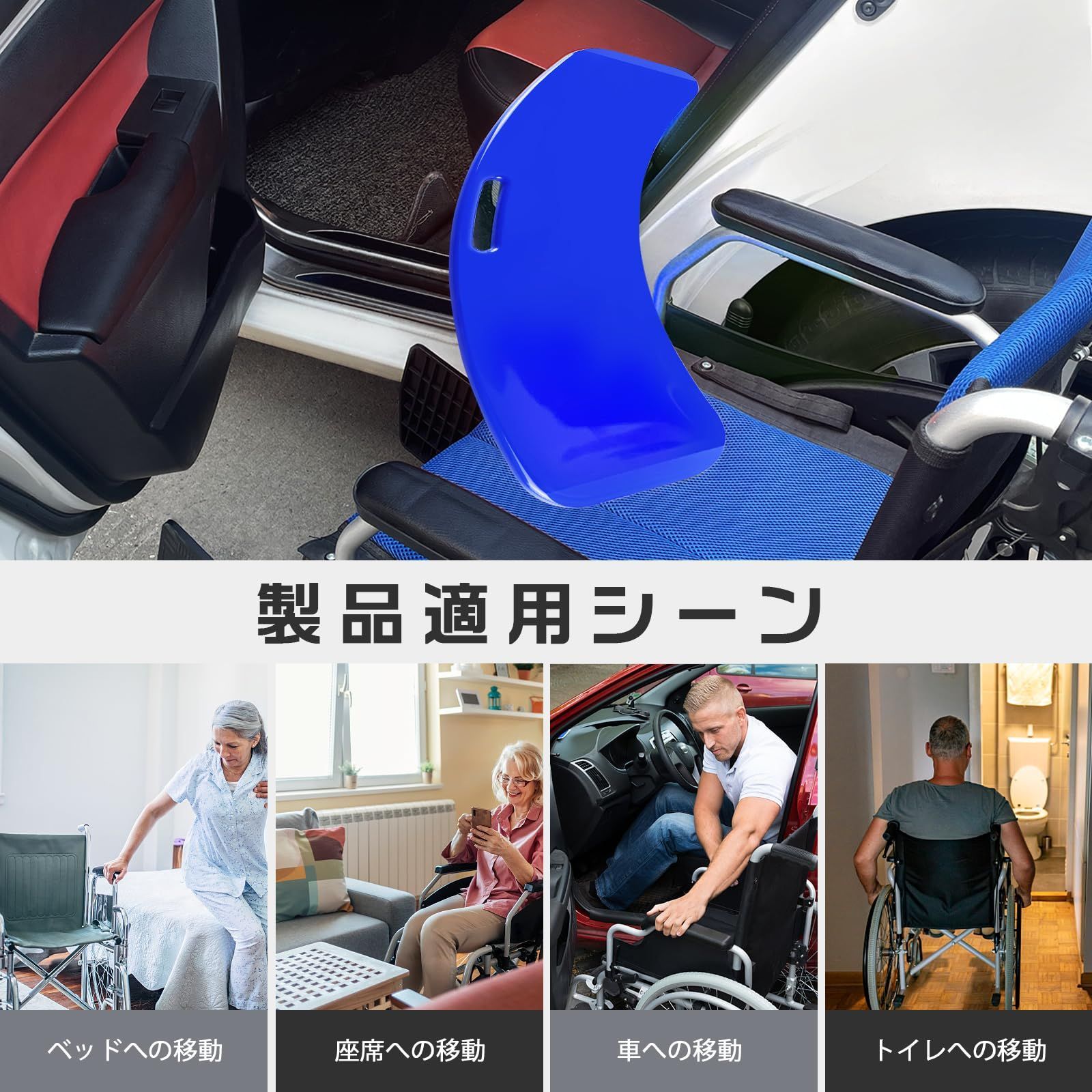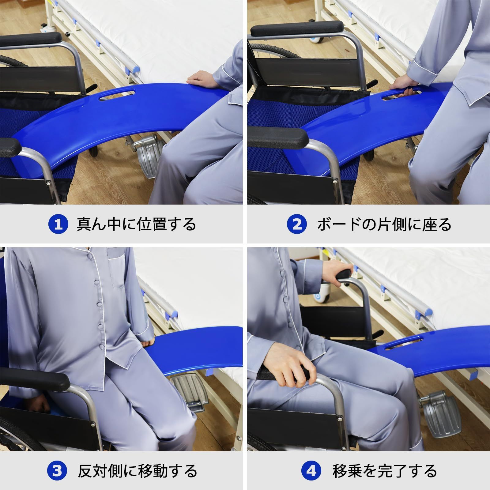 【利便性の提供】:移乗ボードは、病人や高齢者、障害者が車椅子やベッド、自動車、ソファチェア、トイレなどを移動する際に役立ち、患者や介護者に利便性を提供します。