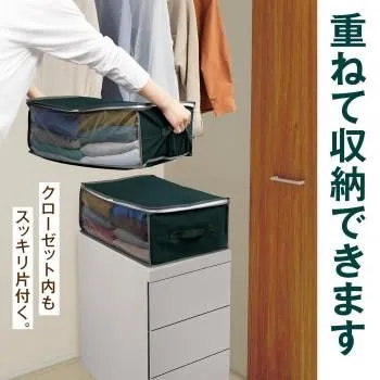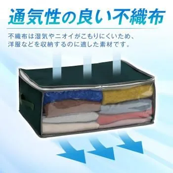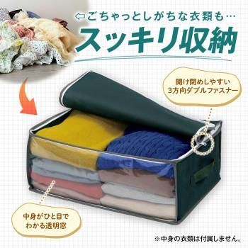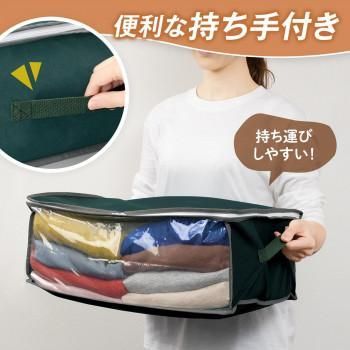 持ち手付きで持ち運びしやすい衣類収納ケース。中身が見える透明窓・3方向ダブルファスナーで洋服が出し入れしやすい。不織布製で通気性が良く、衣類などの収納に適しています。