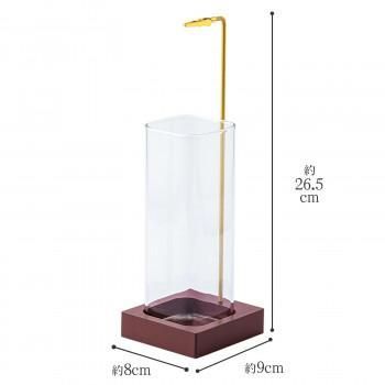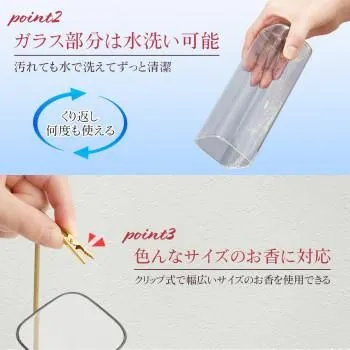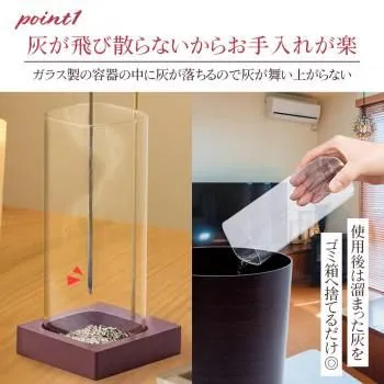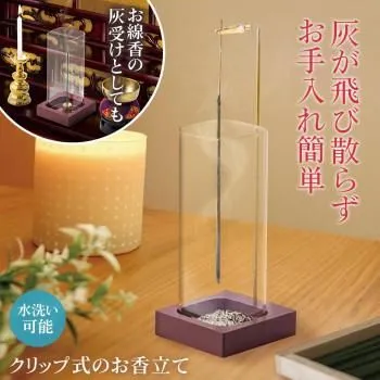 灰が飛び散らないお香立て!ガラス製の容器に灰が落ちるため掃除がらくちん。クリップで挟めるタイプのため、幅広いサイズのお香(竹芯香)を使用できる。シンプルなデザインでどんなシーンにも馴染みやすい。