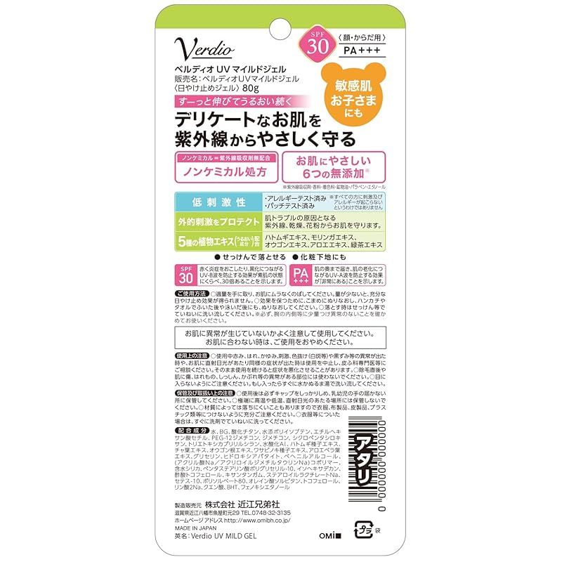 【商品詳細】 ブランド:Verdio 商品種別:全身用日焼け止め 商品名:UVマイルドジェル 製造元:近江兄弟社 商品番号:4987036535163 発売日:2021年02月13日 商品内容:80グラム (x 1)
