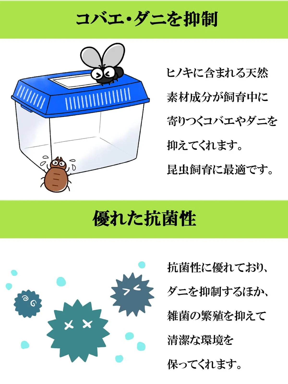 【?気になるにおいを消臭!】昆虫飼育特有の気になるにおいをヒノキの成分がしっかり消臭してくれます。