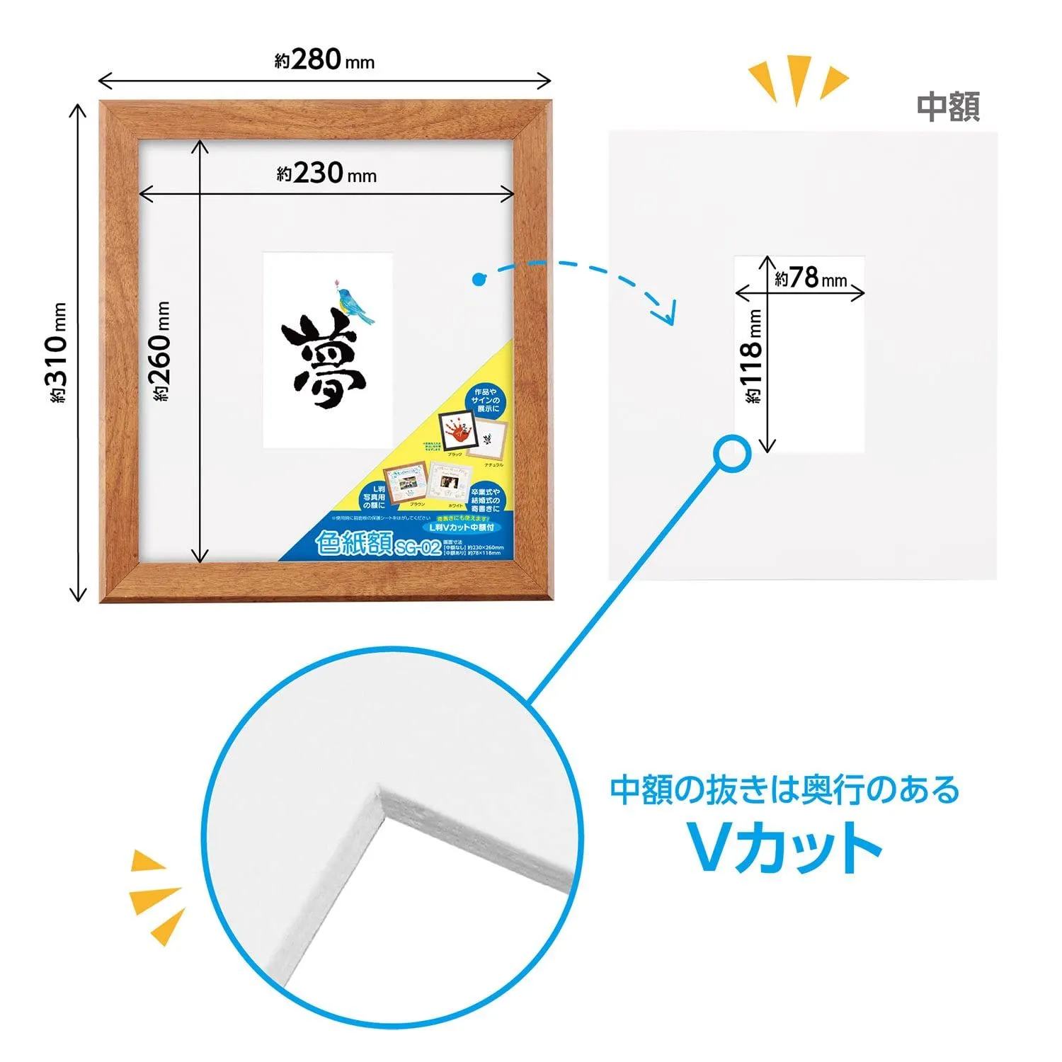 フレーム材質 : 木製、額縁外寸法 : 約W280×H310×D18mm、画面サイズ : 約W230×H260mm、マット中抜サイズ : 約W78×H118mm、前面板 : PS板、重量 : 約560g、参考収容寸法 : 色 紙 : 約242×H272mm、L判写真 : 約W89×H127mm