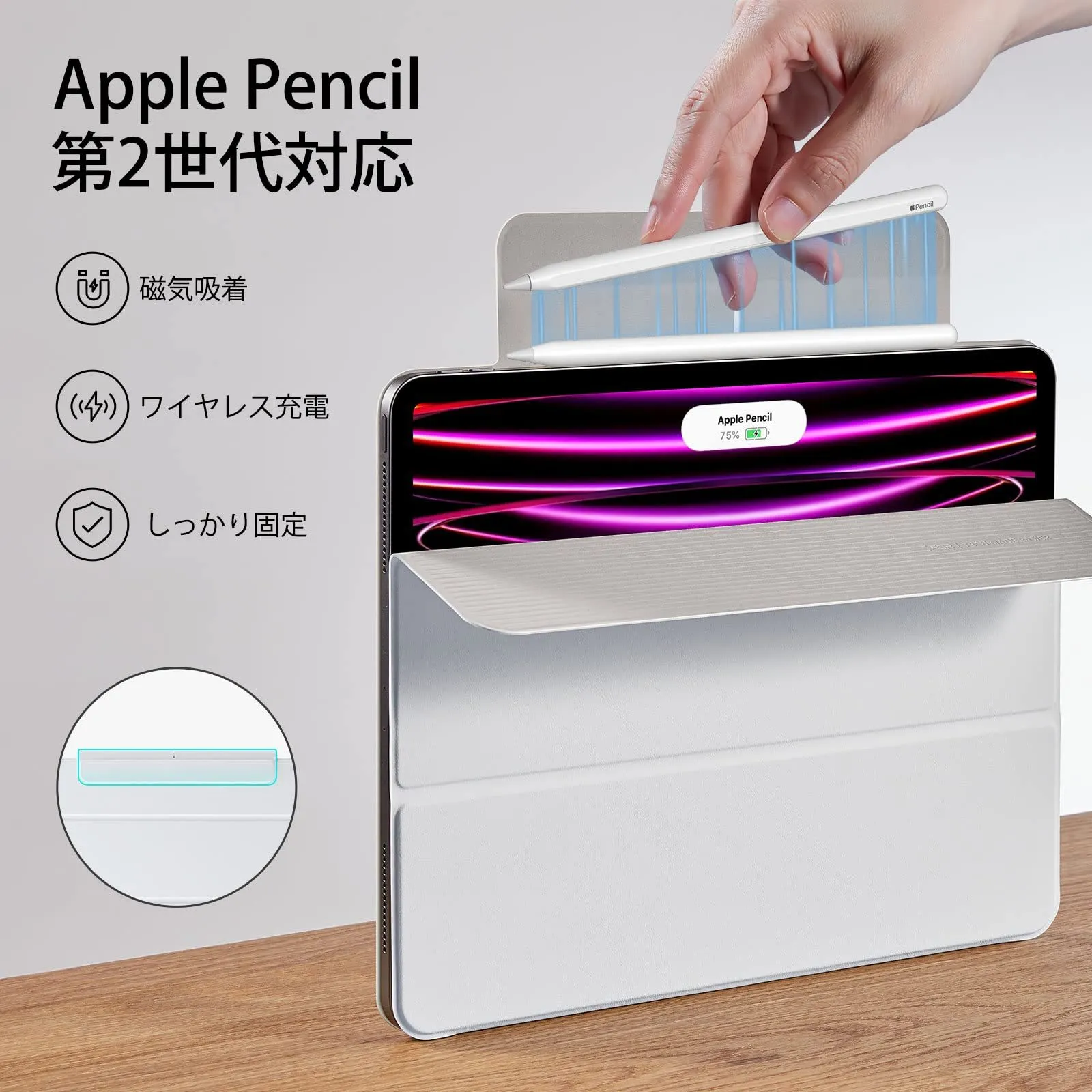 【Pencil 2対応】:Pencil 2の磁気ペアリングとワイヤレス充電に対応した磁気留め具により、外出時もペンシルをしっかり保護して固定