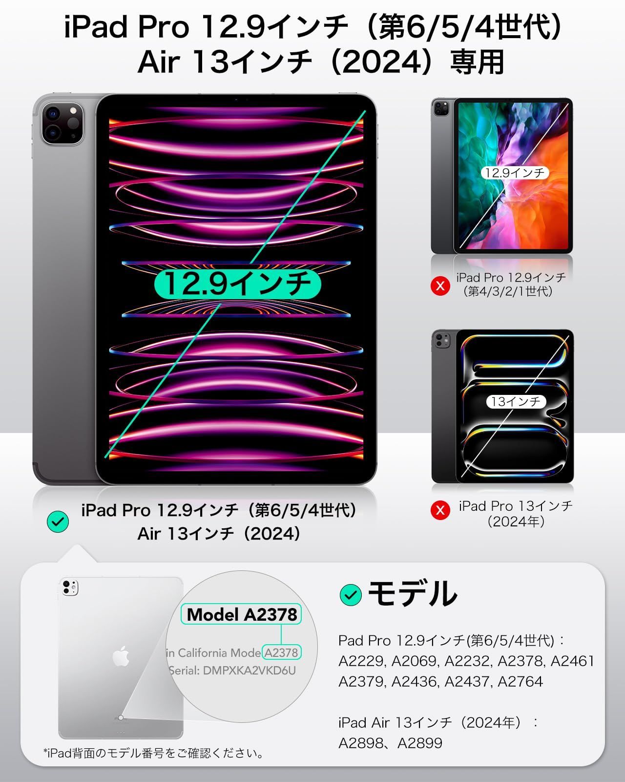 【互換性】:iPad Pro 12.9インチ (2022/2021/2020モデル) 、iPad Air 13インチ(2025/2024モデル)専用です。対応モデル:A2898、A2899、A2378、A2461、A2379、A2462、A2229、A2069、A2232、A2233、A1876、A2014、A1895、A1983。他のiPadモデルと互換性がありません
