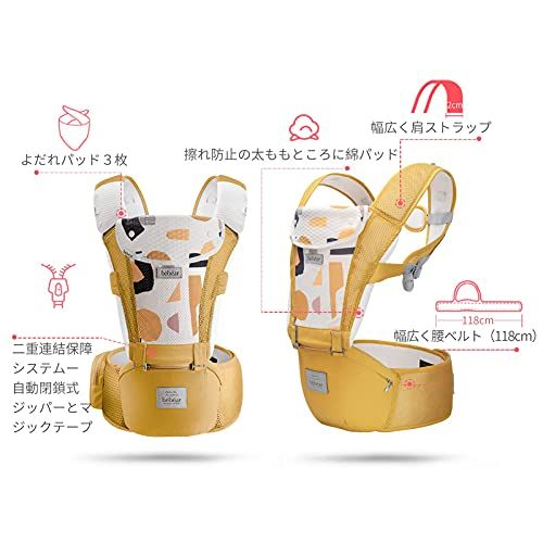 [特徴]取り外せるよだれカバー3枚。引っかけ式ベビーフード。メッシュタイプのフロントカバー、通気性と透湿性に優れます。上下部分にはマジックテープと自動閉鎖式ジッパーという二重連結システムが設計します。H型両肩ストラップ、肩紐の滑ることが防止できます。携帯、おつり、ティッシュなどの小物を収納するサイドポケット。メッシュタイプの肩紐と腰ベルト。ほかに、肩と腰、お腹部分にはスポンジが入って、長時間装着しても蒸し暑くなくて快適です。太ももところに綿製パッド