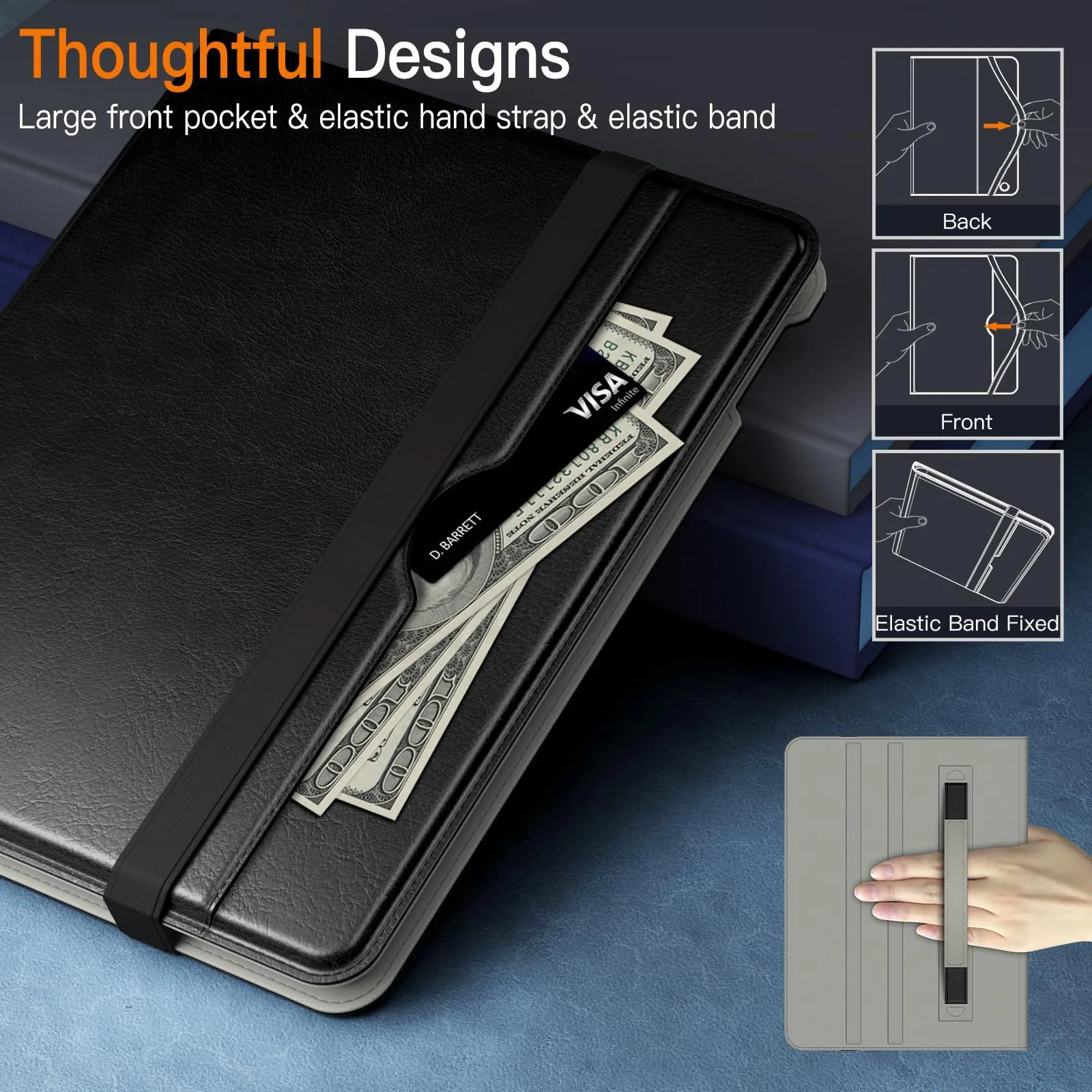 [多機能] カード、現金、メモなどを収納できる大きなフロントポケット。また、iPadをケースにしっかりと固定するための外側の伸縮性のあるストラップが付属しており、調節可能な内側のハンドストラップはiPadをしっかりと保持するのに役立ちます