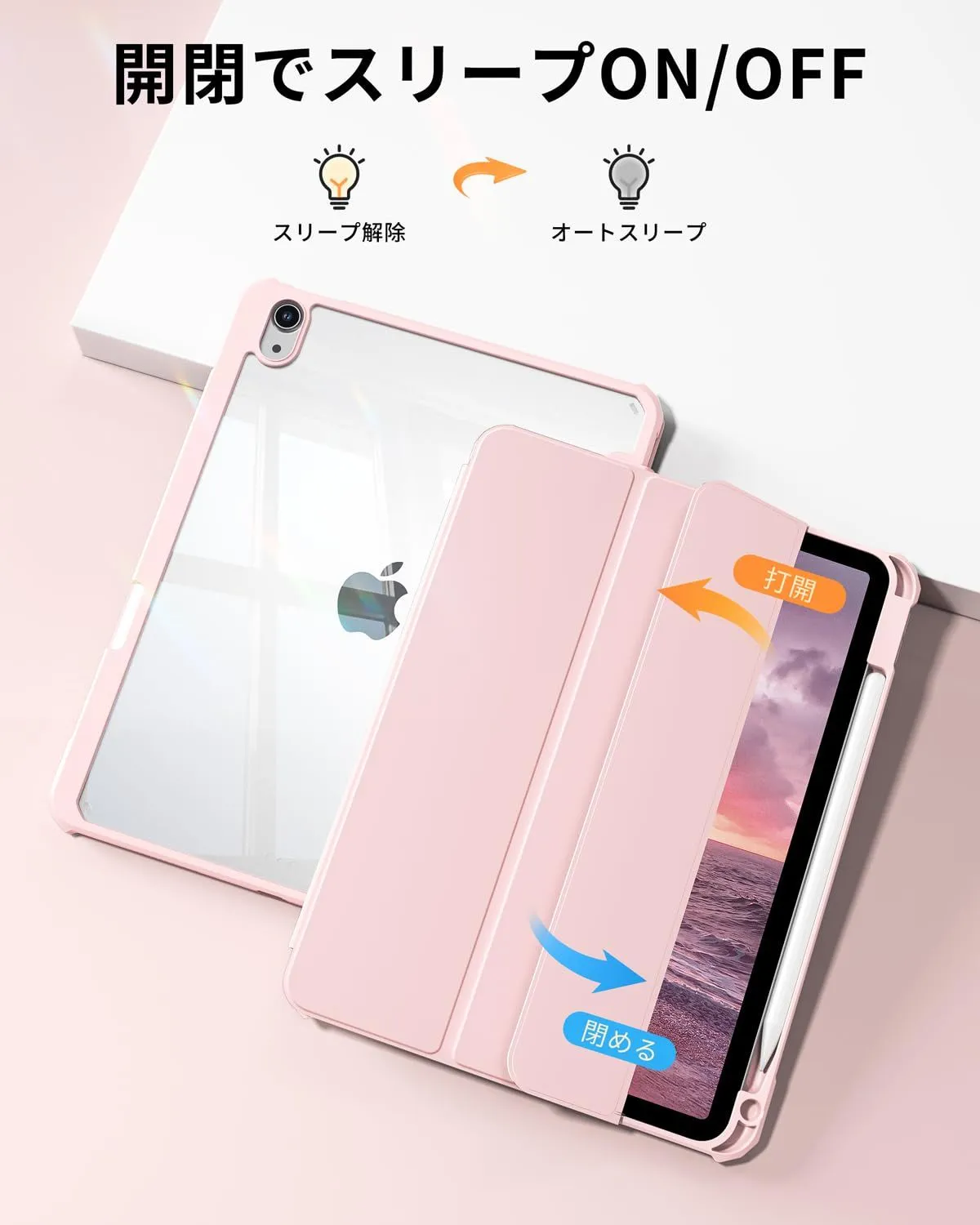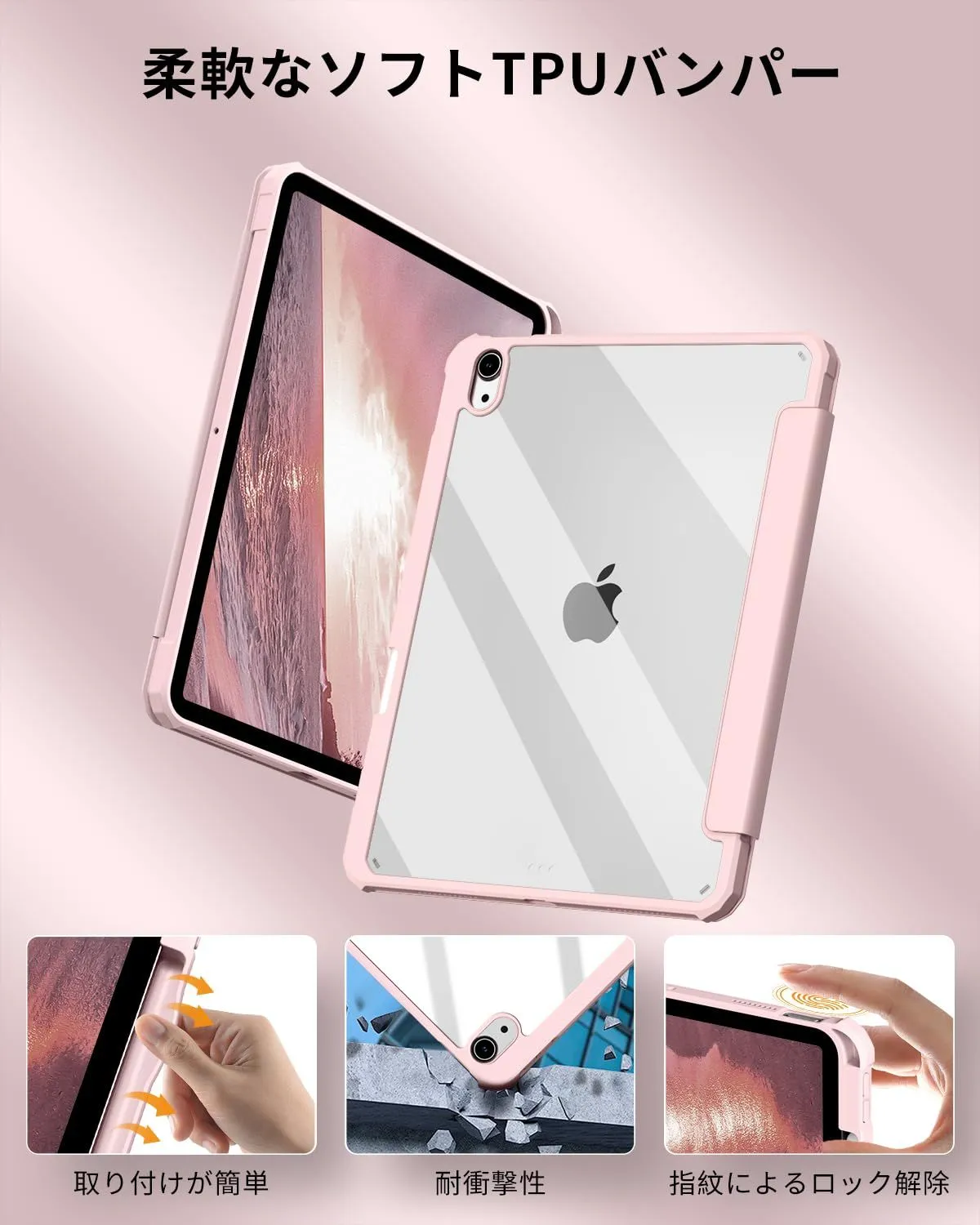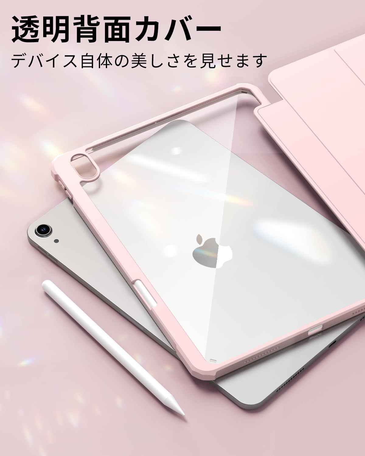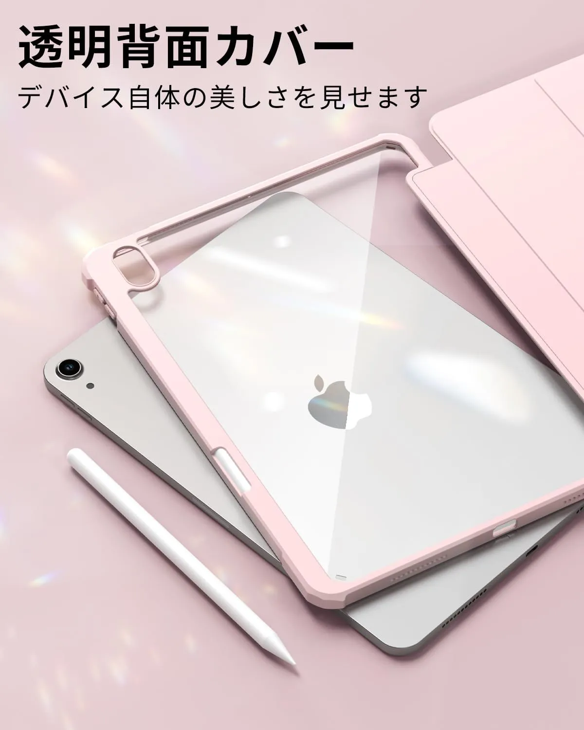 iPad 11世代 ケース A16 (2025) iPad 第11/10世代 10.9インチ (2022) 透明バックカバー ペンシルホルダー付き 三つ折りスタンド Touch IDとオートスリープ機能対応 軽量 薄型 傷つけ防止 PU合成レザー TPU ピンク