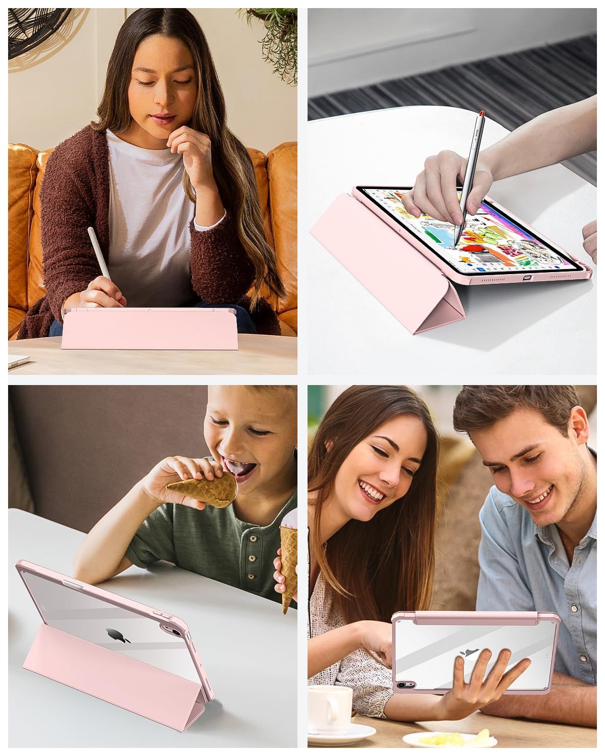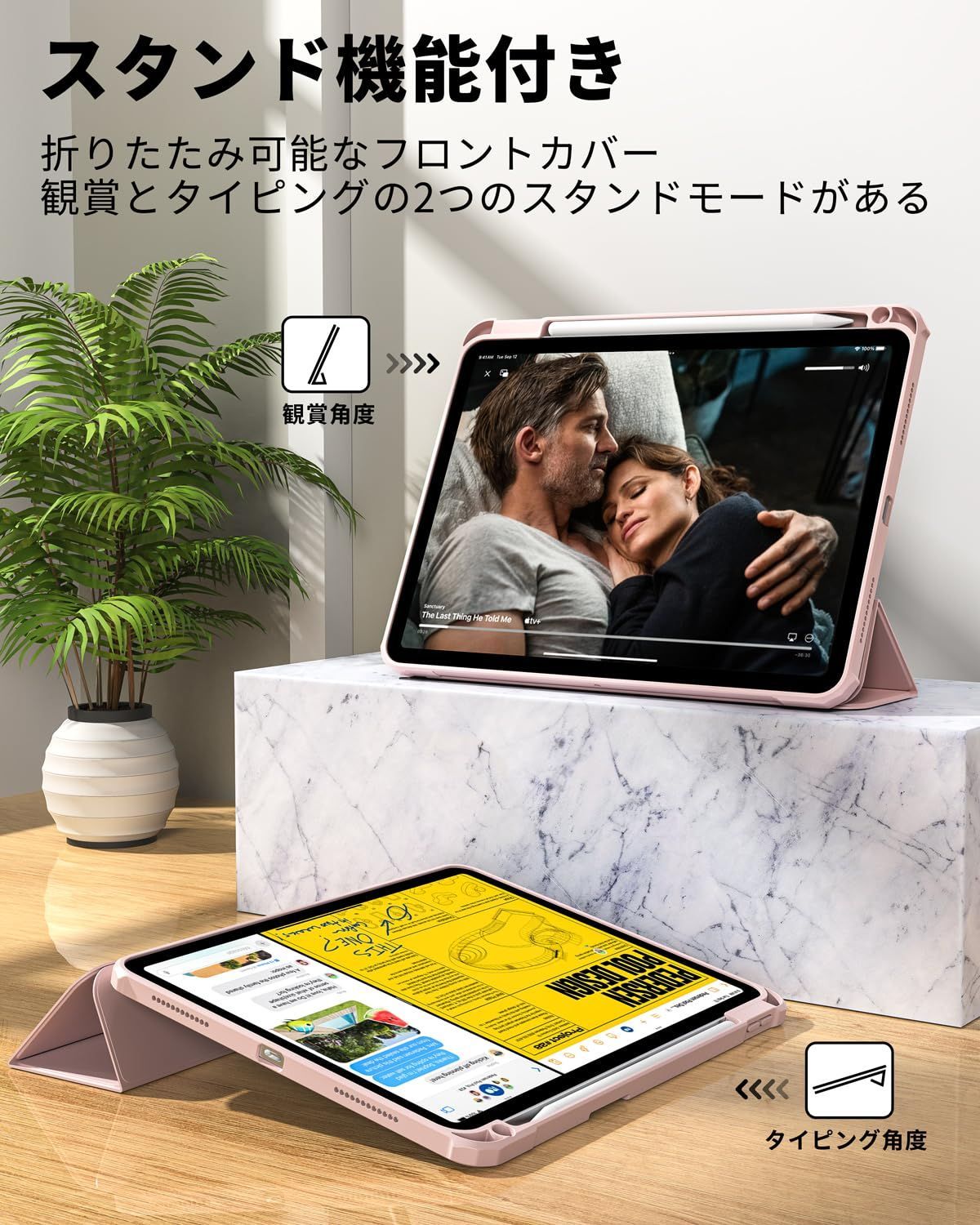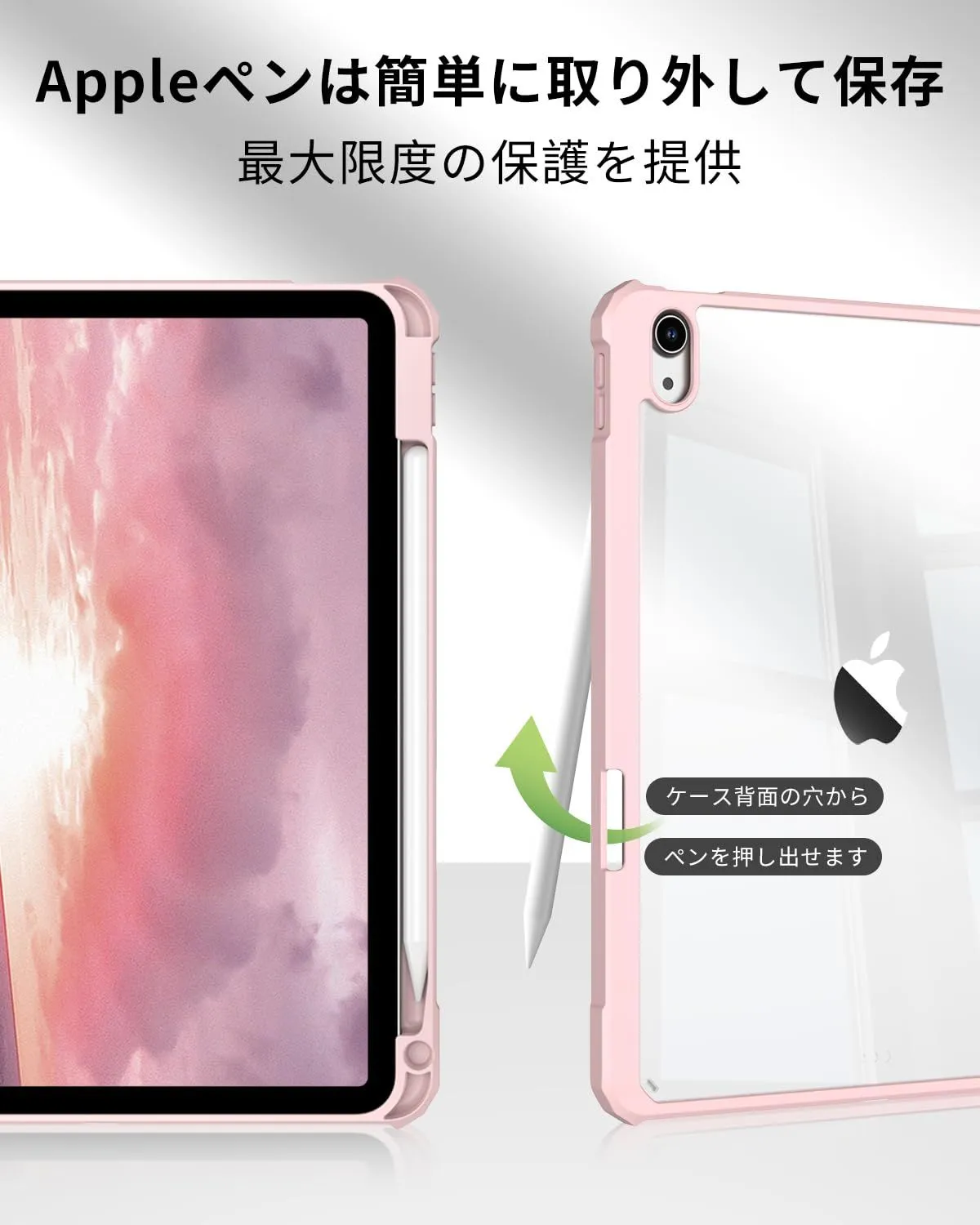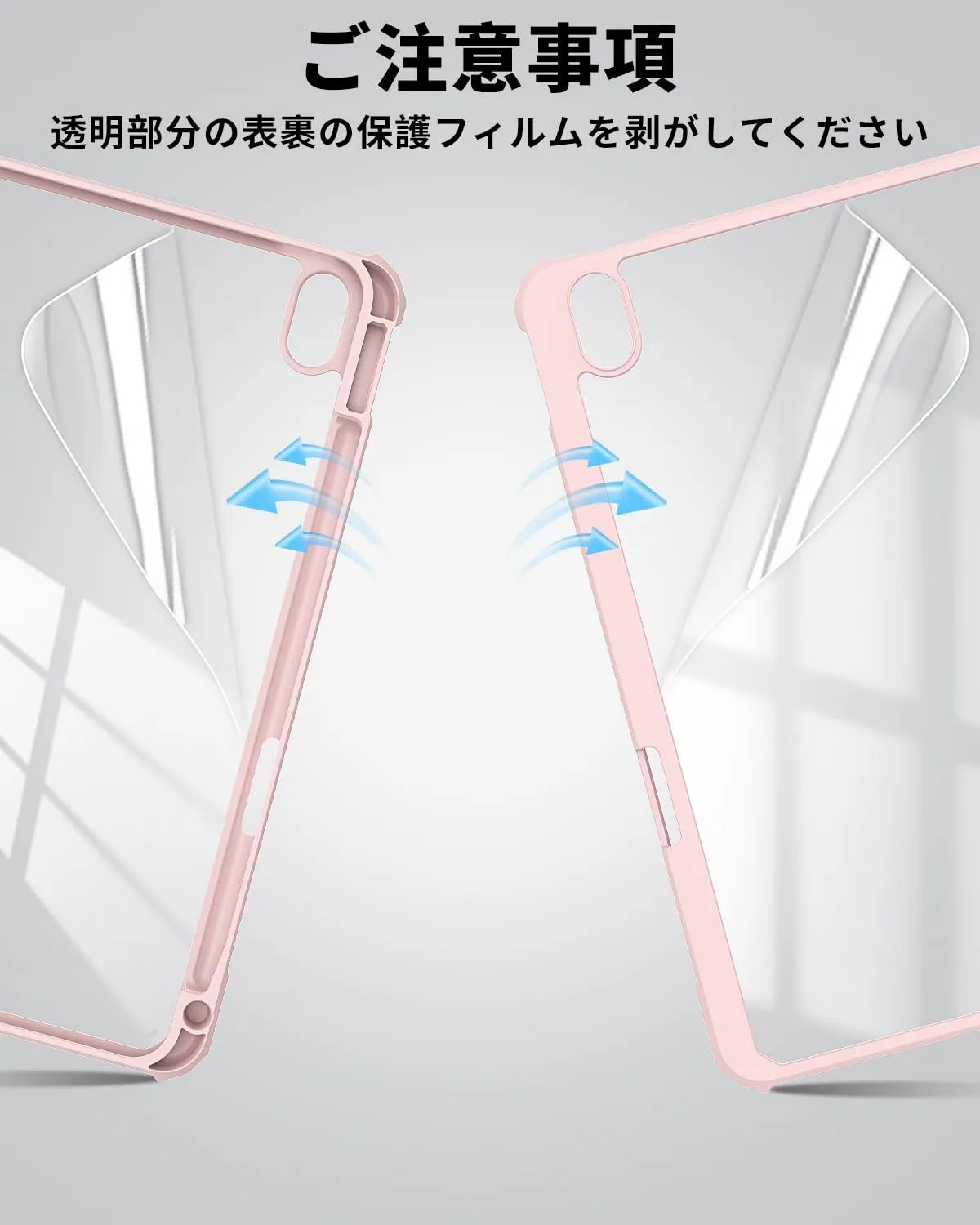 iPad 11世代 ケース A16 (2025) iPad 第11/10世代 10.9インチ (2022) 透明バックカバー ペンシルホルダー付き 三つ折りスタンド Touch IDとオートスリープ機能対応 軽量 薄型 傷つけ防止 PU合成レザー TPU ピンク