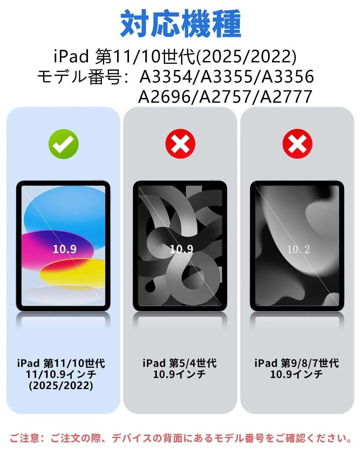 【対応機種】SQBEBS ケース iPad 11世代 (A16) 11インチ 2025 / 第10世代 10.9インチ 2022 に適用します。 (モデル番号:A3354/A3355/A3356/A2696/A2757/A2777)。ご注意:他のiPadモデルとは互換性がありません、ご注文の際、デバイスの背面にあるモデル番号をご確認ください。