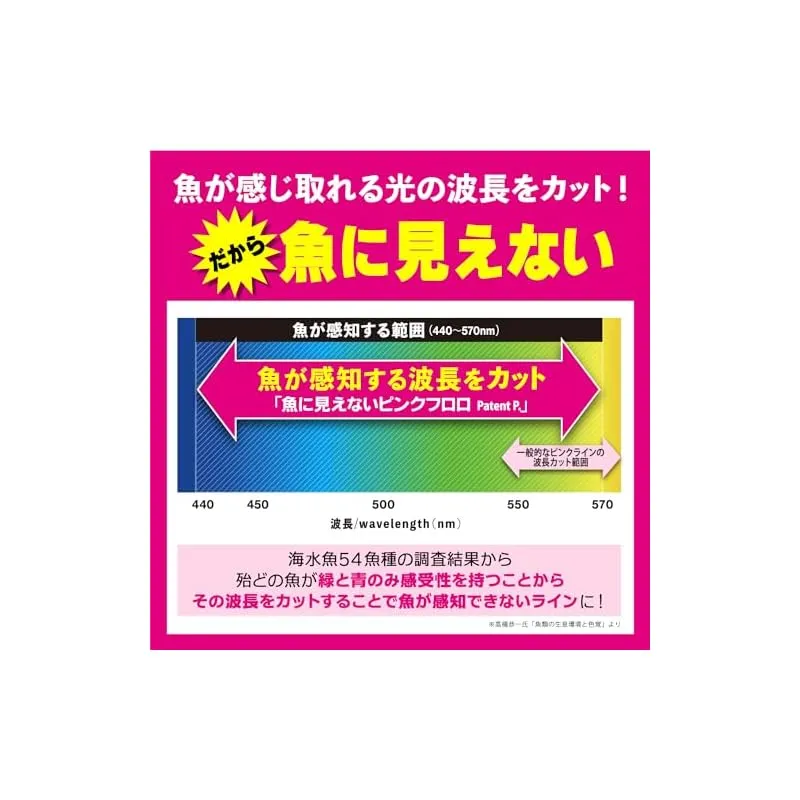 ◆人に見やすく魚に見えにくい「ステルスピンク」採用、一般的なピンクラインよりも幅広く”魚に見えない色相領域”をカバー