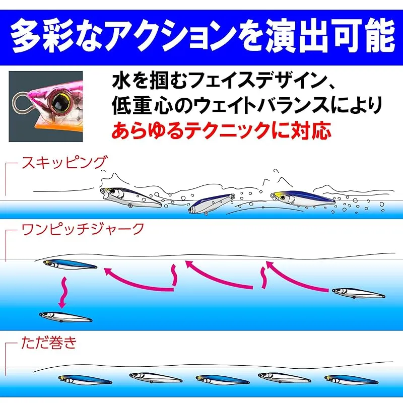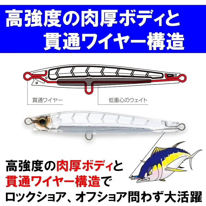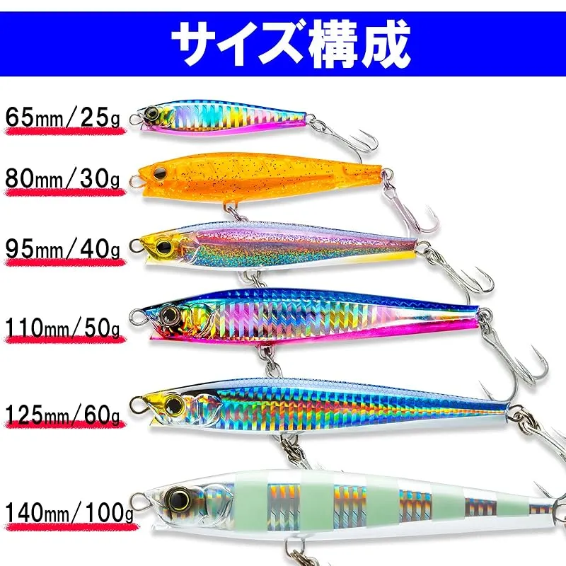【商品概要】 サイズ:65mm 重量:25g リングサイズ:#4 フックサイズ:#4 最大飛距離:100m Over