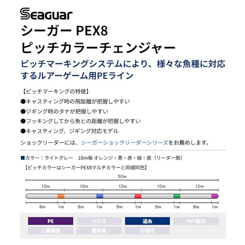 【シーガー PEX8 ピッチカラーチェンジャー】……「単色のメインカラー」+「10m毎にカラーローテーションする単色5色のピッチカラー」を採用した「シーガー PEX8」! 「単色+バイトマーカー」「5色マーキング」のメリットを併せ持つ「新たなピッチマーキングシステム」搭載で、ルアーとの距離間隔をより鮮明に把握しフグによる高切れなどを防ぐ「高視認性」「ステルス性」「高感度性能」「高強力性能」を併せ持つこだわりの日本製・8本組PEライン!