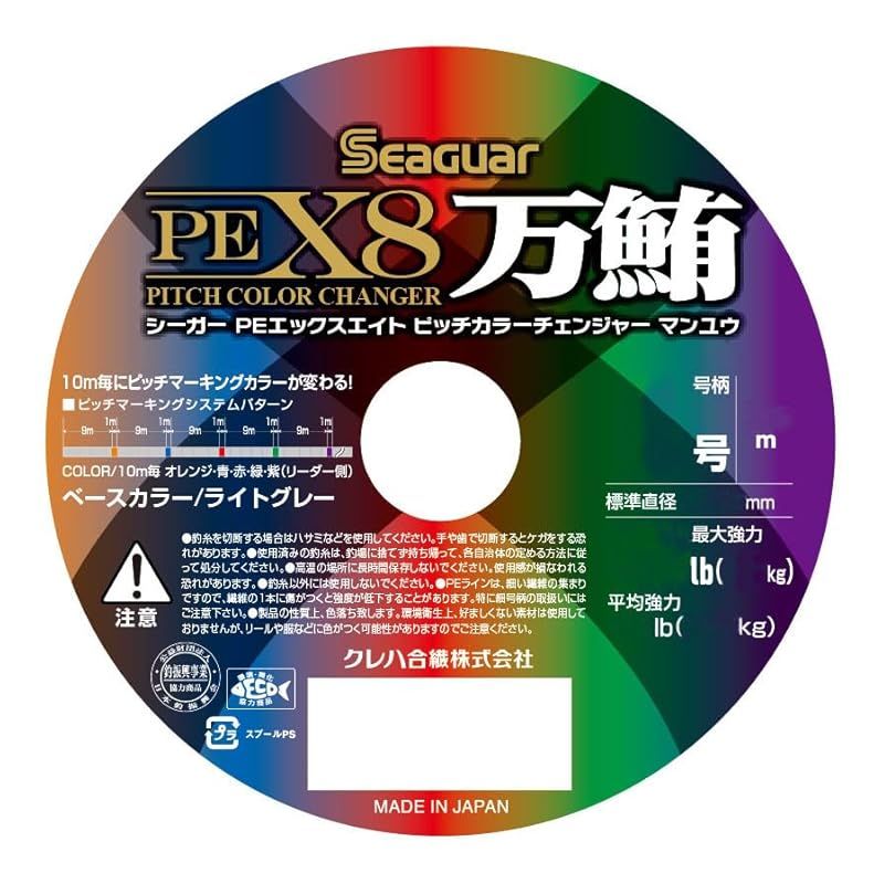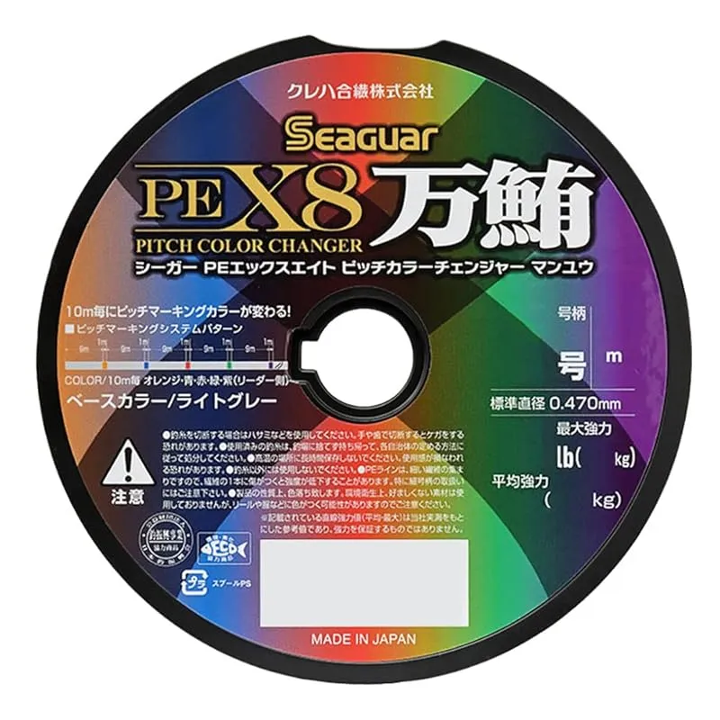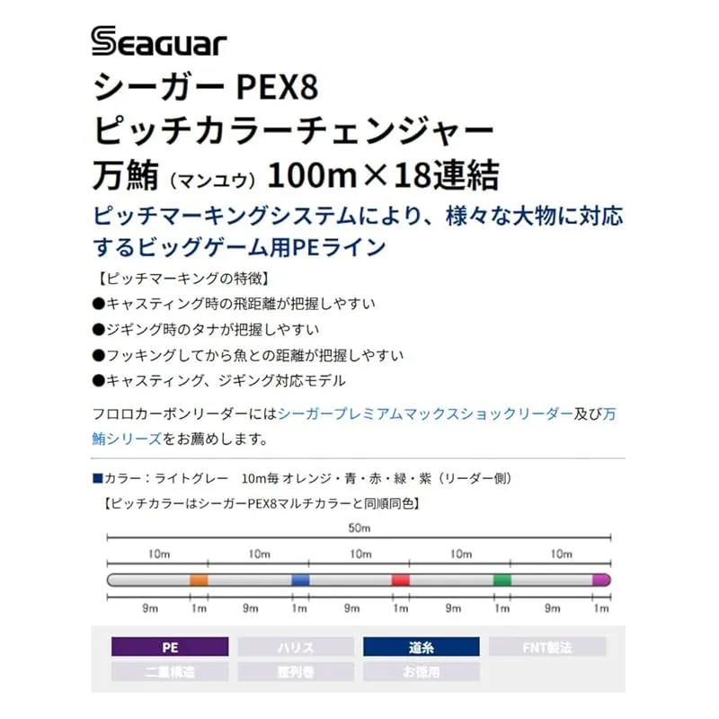 【シーガー PEX8 ピッチカラーチェンジャー 万鮪】……「単色のメインカラー」+「10m毎にカラーローテーションする単色5色のピッチカラー」を採用した「シーガー PEX8」! 「単色+バイトマーカー」「5色マーキング」のメリットを併せ持つ「新たなピッチマーキングシステム」搭載で、ルアーとの距離間隔をより鮮明に把握しフグによる高切れなどを防ぐ「高視認性」「ステルス性」「高感度性能」「高強力性能」を併せ持つこだわりの日本製・8本組PEライン!
