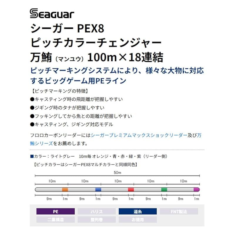 商品名:シーガー(Seaguar) SeaGuar PEX8 PITCH COLOR CHANGER (シーガー ピーイーエックスエイト ピッチカラーチェンジャー) 万鮪 ライトグレー (5色カラーマーキング付き) 連結タイプ 100m×18連結 1800m 10号