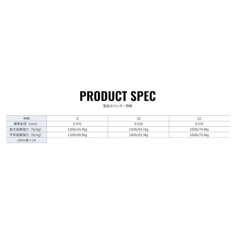 サイズ: 10号 (標準直径 dia.0.52mm) / 最大強力: MAX.150lb (68.1kg) / 平均強力: AVE.140lb (63.5kg)