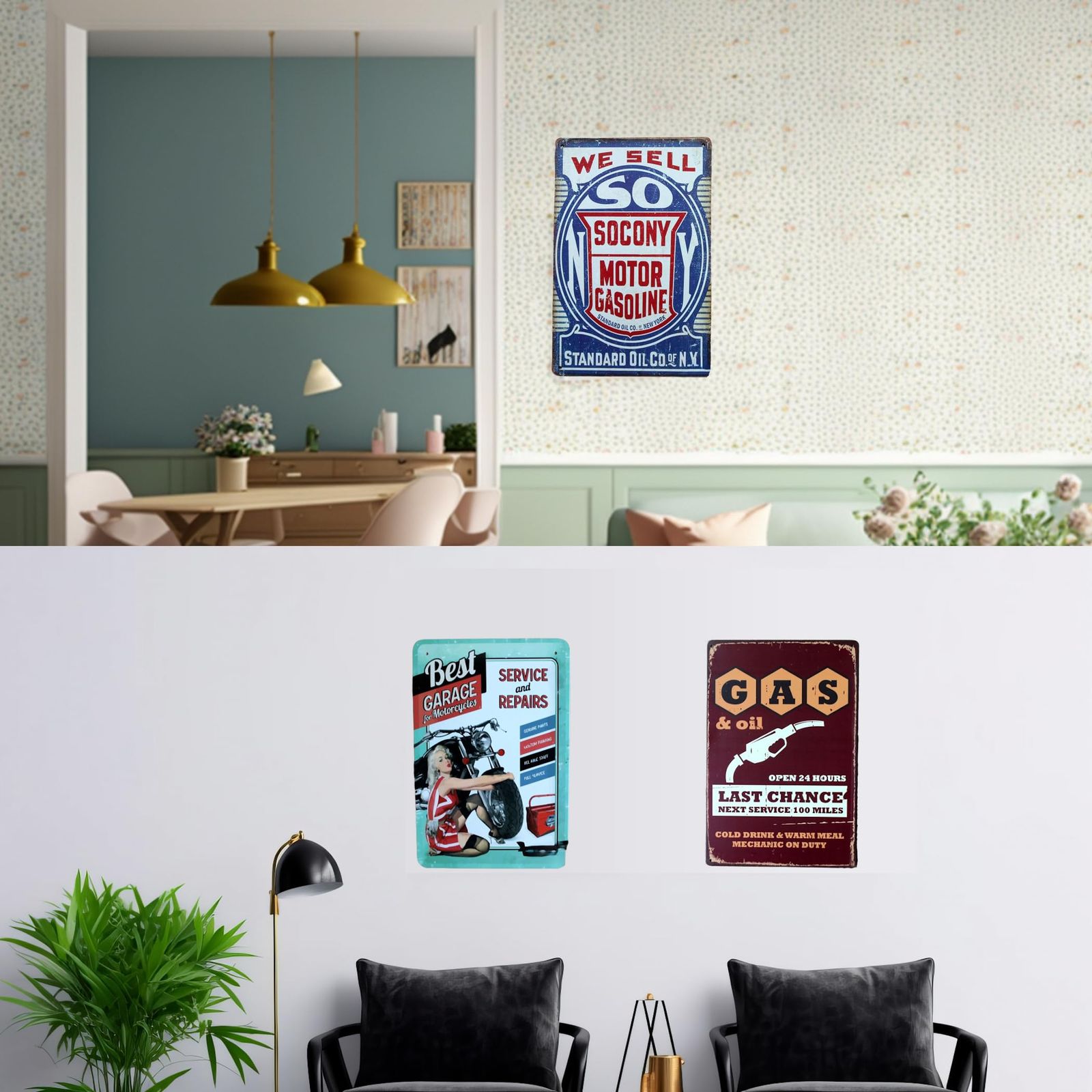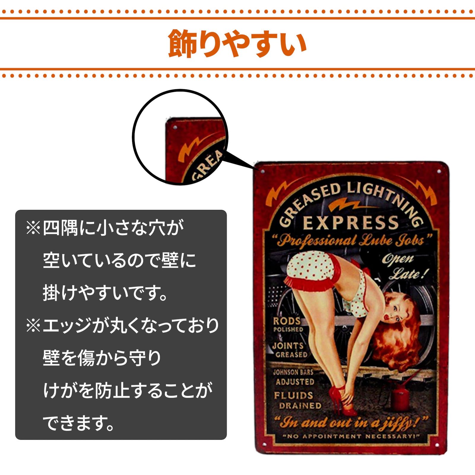 ノスタルジック : ヴィンテージアメリカをイメージしたブリキプレートです。古き良き時代のノスタルジックな雰囲気を味わえるデザインで、アンティークな風合いがおしゃれなアクセントになります。お家やお店のインテリアにはもちろん、プレゼントにもぴったりです。