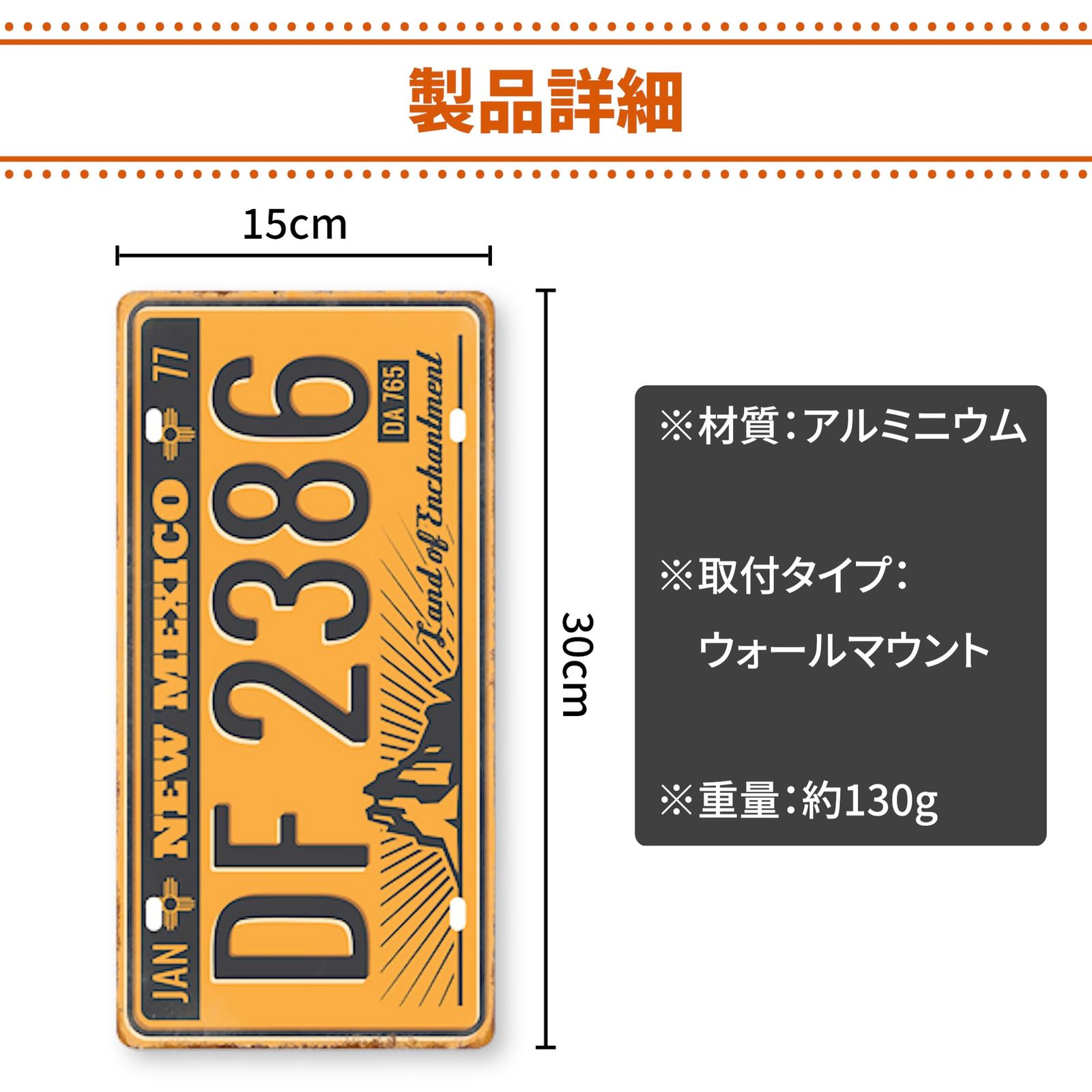 商品仕様 : 材質:アルミニウム 取付タイプ:ウォールマウント 重量:約150g サイズ:20cm×30cm(ナンバープレート:15cm×30cm)