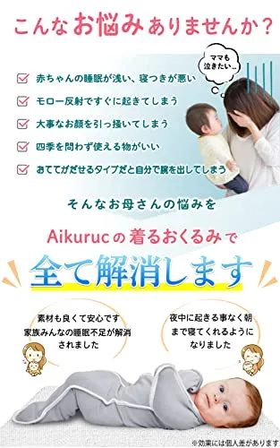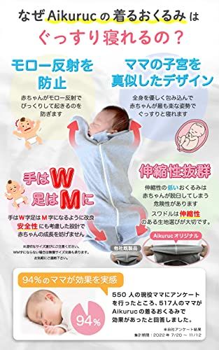 【赤ちゃんに安定した睡眠を】当社の着るおくるみは赤ちゃんの睡眠を妨け?る『モロー反射』を落ち着かせる効果か?あり、新生児の良質な睡眠に役立つといわれています。ママの子宮の中の居心地を再現したデザインになっている為、全身を優しく包み込んで赤ちゃんが最も楽な姿勢でぐっすりと眠れます。