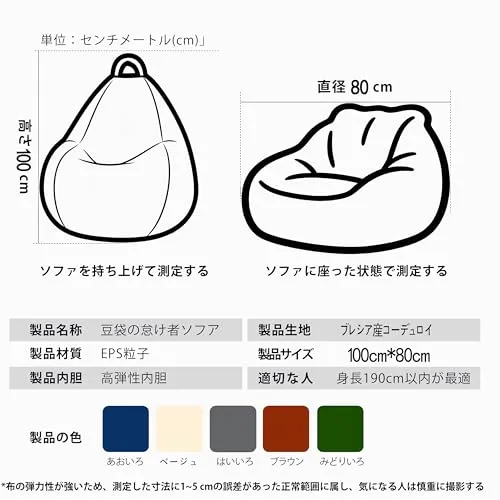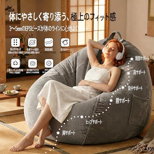 【全身を包み込む特大ビーズソファ】 体のラインにやさしくフィットし、全身をふんわり包み込む特大ビーズソファです。どんな姿勢でも自然にくつろぐことができ、一人掛けソファとしてゆったりとお過ごしいただけます。サイズはM(7060cm)、L(10080cm)、XL(120100cm)の3種類をご用意しておりますので、ご使用シーンや用途に合わせてお選びいただけます。