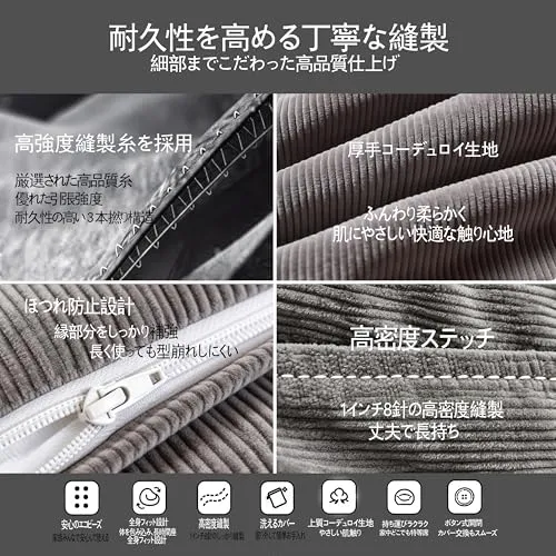 【上質なコーデュロイ生地】 厳選されたコーデュロイ素材を使用し、なめらかで心地よい肌触りを実現。伸縮性に優れた生地は体にやさしくフィットし、圧力を解放するとすぐにふんわりと元の形に戻ります。通気性が良く、蒸れにくいため一年中快適にご使用いただけます。さらに、耐摩耗性・耐汚れ性にも優れており、長く愛用できるのも魅力です。