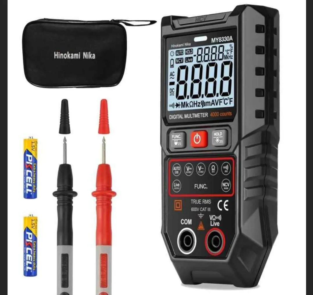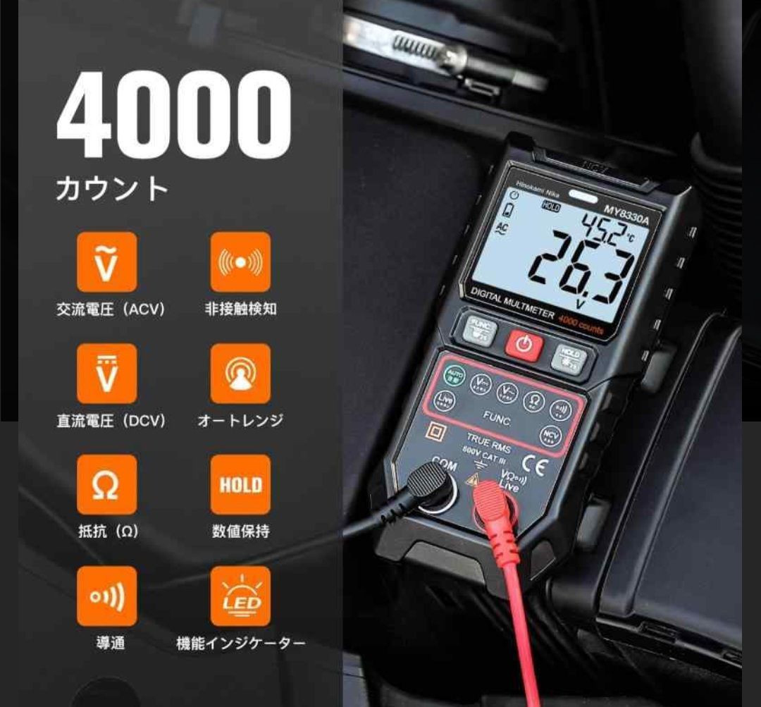 【スマートテスター】Hinokami NikaオートレンジマルチメーターMY8330Aは、TRMS4000カウントで、手動で測定することの上に、オートモードにより、電圧、抵抗、導通など機能を自動的かつ迅速に識別できます。交流電圧を測定するとき、周波数も表示されます。初心者から車のメンテ、自宅での作業まで幅広くご利用いただけます。