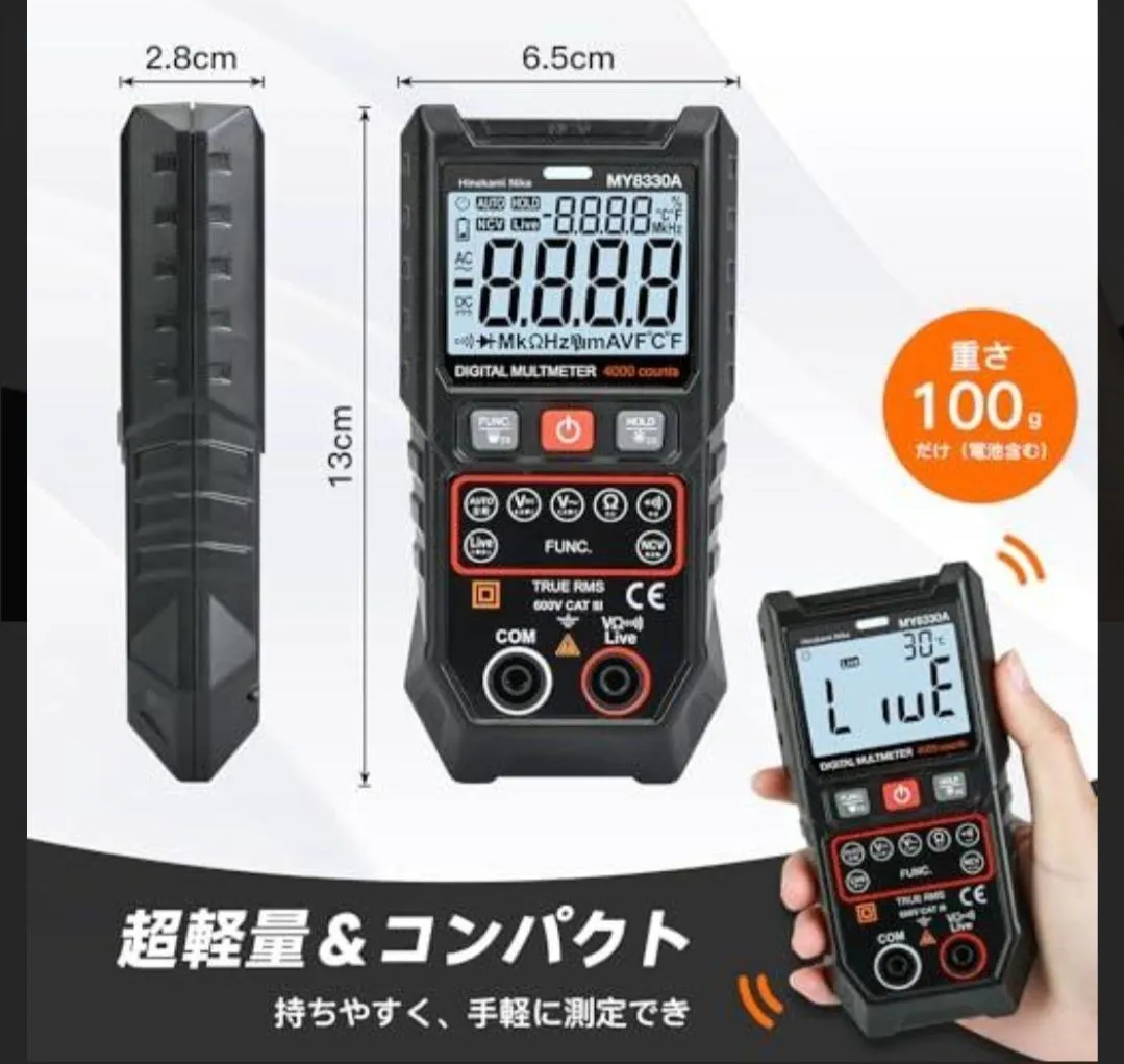 【超軽量&便利性】MY8330Aマルチテスターは便利に使えるように設計され、ただ100gの超軽量、手軽に測定でき、持ち運びや収納のやすいポケットテスター。便利な数値保持、バックライトと懐中電灯も付きます。別売しておる収納ケースも得る可能、ご希望の場合はお問い合わせください。