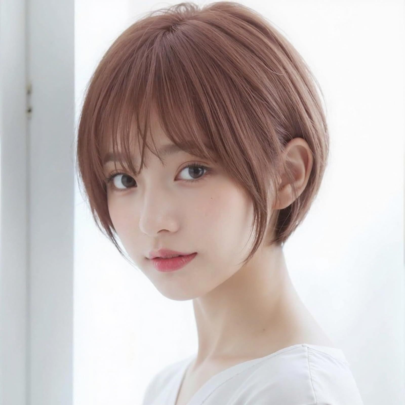 ヘアスタイルのスタイル:このヘアスタイルは、クラシックなショートヘアの要素を取り入れ、適度な前髪を合わせて、清潔感のある自然なスタイルを作り出しています。ショートヘアは顔の形を効果的に修正でき、特に丸顔や四角顔の方にとっては、顔のラインを引き伸ばし、より柔らかな輪郭を演出します。さらに、前髪の追加によってファッション感が増し、全体のスタイルがより活き活きとした印象になります。
