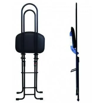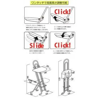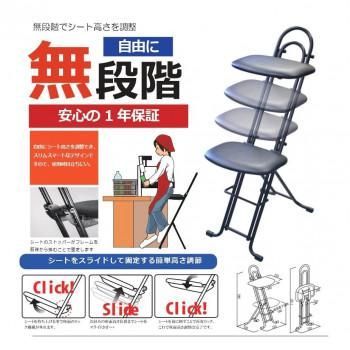 低座位置から高座位置までの作業をサポートでき、身長差のあるユーザーのご使用もこれ1台でOKです。その美しくスタイリッシュなフォルムは武蔵野美術大学「折り畳み椅子80脚展」に展示され、その後所蔵されており、ライブイベントなどの音楽関係、飲食店やブティックなどのファッショナブルな店舗への導入も増加しております。