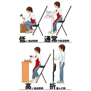 低座位置から高座位置までの作業をサポートでき、身長差のあるユーザーのご使用もこれ1台でOKです。その美しくスタイリッシュなフォルムは武蔵野美術大学「折り畳み椅子80脚展」に展示され、その後所蔵されており、ライブイベントなどの音楽関係、飲食店やブティックなどのファッショナブルな店舗への導入も増加しております。
