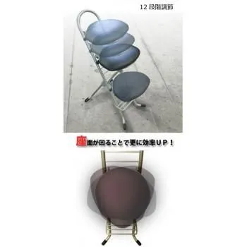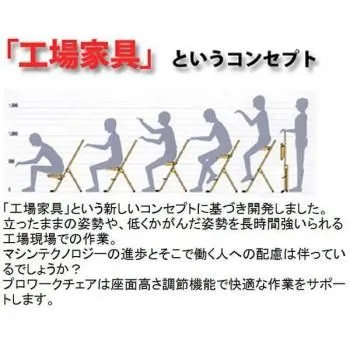 立ったまま、低くかがんだ姿勢など、無理な姿勢で長時間の作業が必要な工場現場で働く方の負担を和らげるために開発されました。長時間椅子に座って同じ姿勢での作業は、背骨や骨盤に負担がかかり、肩こり、近視などの原因の一つと考えられています。座面下部の回転盤により、左右60度回転し、作業効率を向上させます。