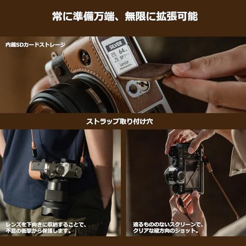 【拡張機能でストレスフリーな創作を実現】内蔵SDカードストレージスロットには予備のメモリーカードを収納可能。頑丈で耐摩耗性に優れたステンレススチール製ベースには1/4"-20ネジ穴を装備。三脚や各種アクセサリーとの互換性により撮影の可能性を広げます。ケースは衝撃保護機能を備え、専用