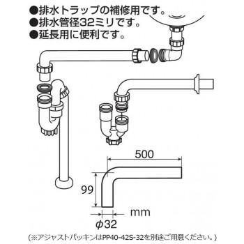排水トラップの補修用です。排水管径32ミリで、排水の延長用に便利です。※アジャストパッキンはPP40-42S-32を別途ご用意ください。