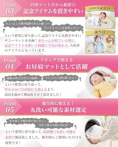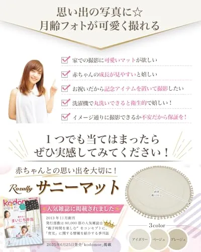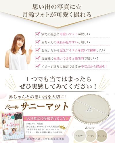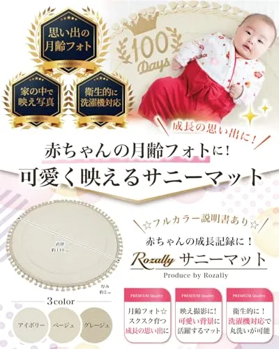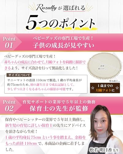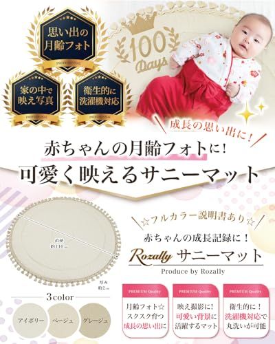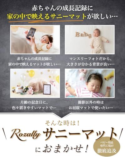 【保育士が監修】 Rozally サニーマット がついに正式販売開始。 「月齢フォトの映える背景に…」「ベビーマットとしてお昼寝に使いたい…」という お客様の声から生まれた 「記念撮影で大活躍」 の 洗える サニーマットです。 リビングに敷いて お昼寝マット や プレイマットとして使用できるのも人気の1つです。 「お七夜」「お宮参り」「初節句」「百日祝い」「お食い初め」「初誕生日」などの、 赤ちゃんの成長記録として記念写真に大人気のイブルマットとなっています。 「ごろ寝」している可愛い寝相を今話題のごろ寝アートとして、 記念写真に残しておくのも大切な思い出になります。 企画&設計では 新生児 や 乳幼児 など 赤ちゃん の育児に詳しい