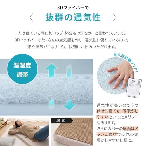 0.3mm0.5mmの超弾力性ファイバーで、適度な弾力で体圧を分散。90%以上が空気層で出来ているので、通気性が抜群。汗や湿気がこもりにくく、快適にお休みいただけます。