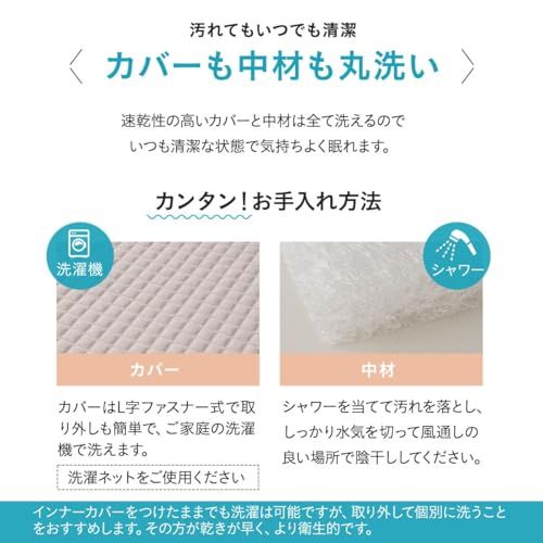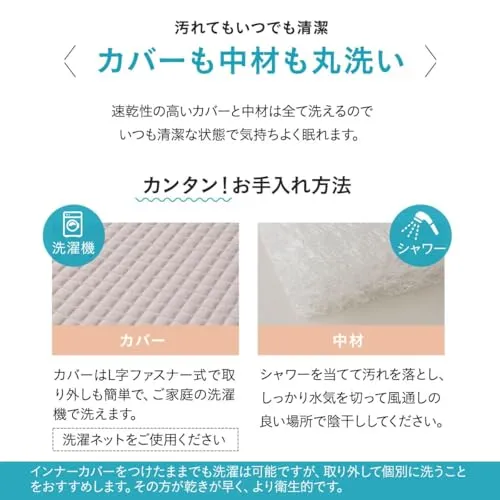 カバーには、ふっくら柔らかな触り心地の膨れニット生地を採用。速乾性の高いカバーと中材は、全て洗えるので、いつも清潔な状態で気持ちよく眠れます。