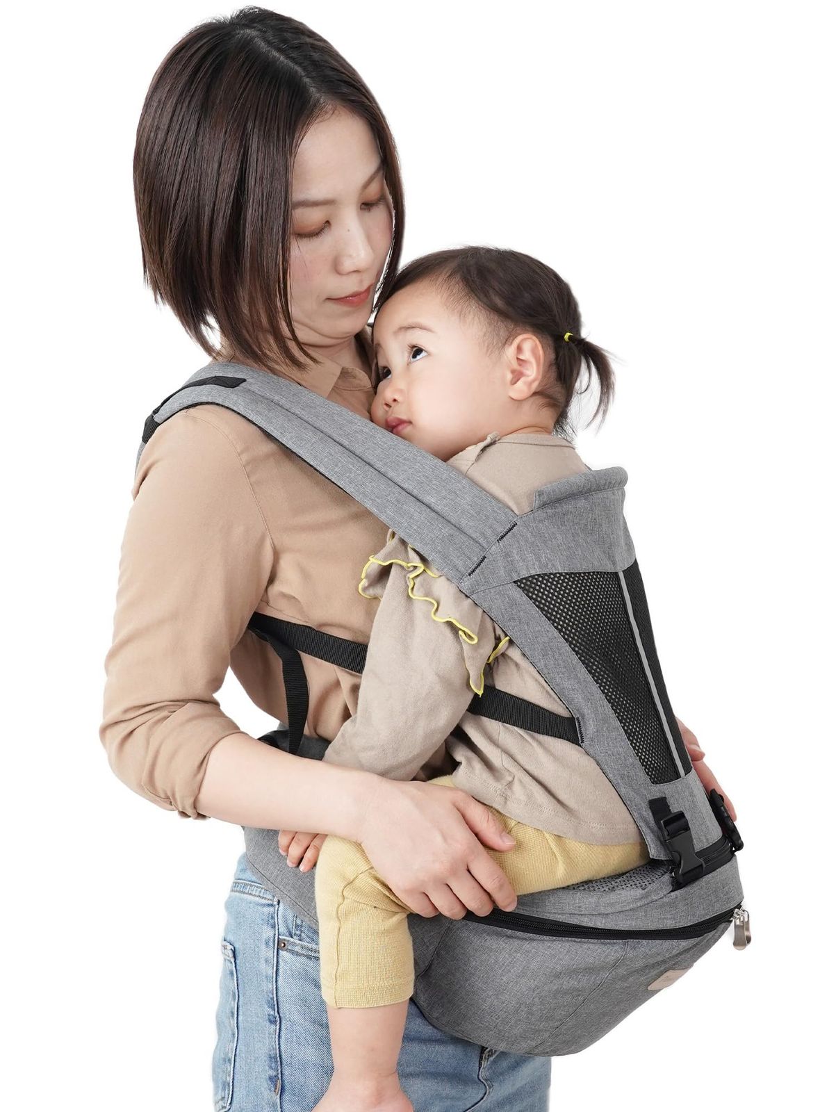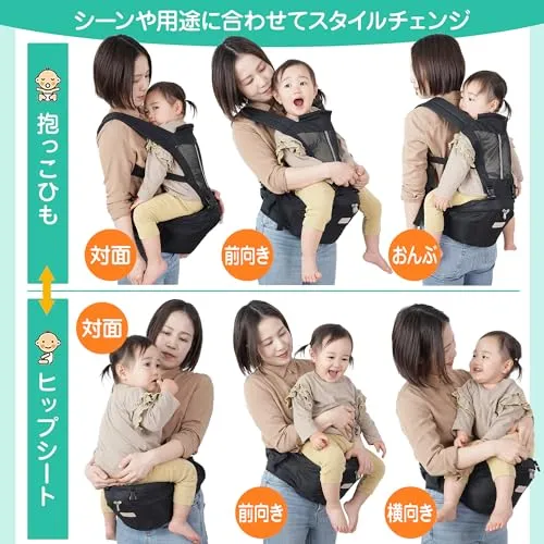 【返品・交換について】 商品に不備があった場合は、評価前にご連絡ください。 内容を確認のうえ、誠実に対応させていただきます。 最後まで気持ちの良いお取引ができるよう努めてまいります。 どうぞよろしくお願いいたします。 2023年12月、この度お客様からのお声をいただき、5点改良しました!! 1?バックルを改良! ヒップシートのバックルをより耐久性に優れたものに改良しました。また、マジックテープの幅も1.5倍に広げました。赤ちゃんの急な体の動きに対しても、しっかりとロックしてくれます。 2?ウエストサイズを改良! 数多く聞かれていた『ヒップシートのベルトが緩い』という問題。お客様には衣服やタオルなどを巻いて調整していただいていました。 ウエスト60センチから115センチまで対応できるよう改良したので、幅広いお客様にご使用いただけます。 3?座面に滑り止めをプラス! ヒップシートの座面部分に滑り止めを付けました。赤ちゃんがずり落ちてしまうのを防ぎます。 4?ロック式ファスナーを採用! ヒップシートと抱っこ紐をつなぐ部分にロック式のファスナーを採用しました。 赤ちゃんの急な動きでもより安心してご使用いただけます。 5?新カラーの追加! ブラック、グレーに加えて、ダークグレーが新登場しました。 万能なカラーで、性別問わないのはもちろん、柔らかい印象を与えてくれます。