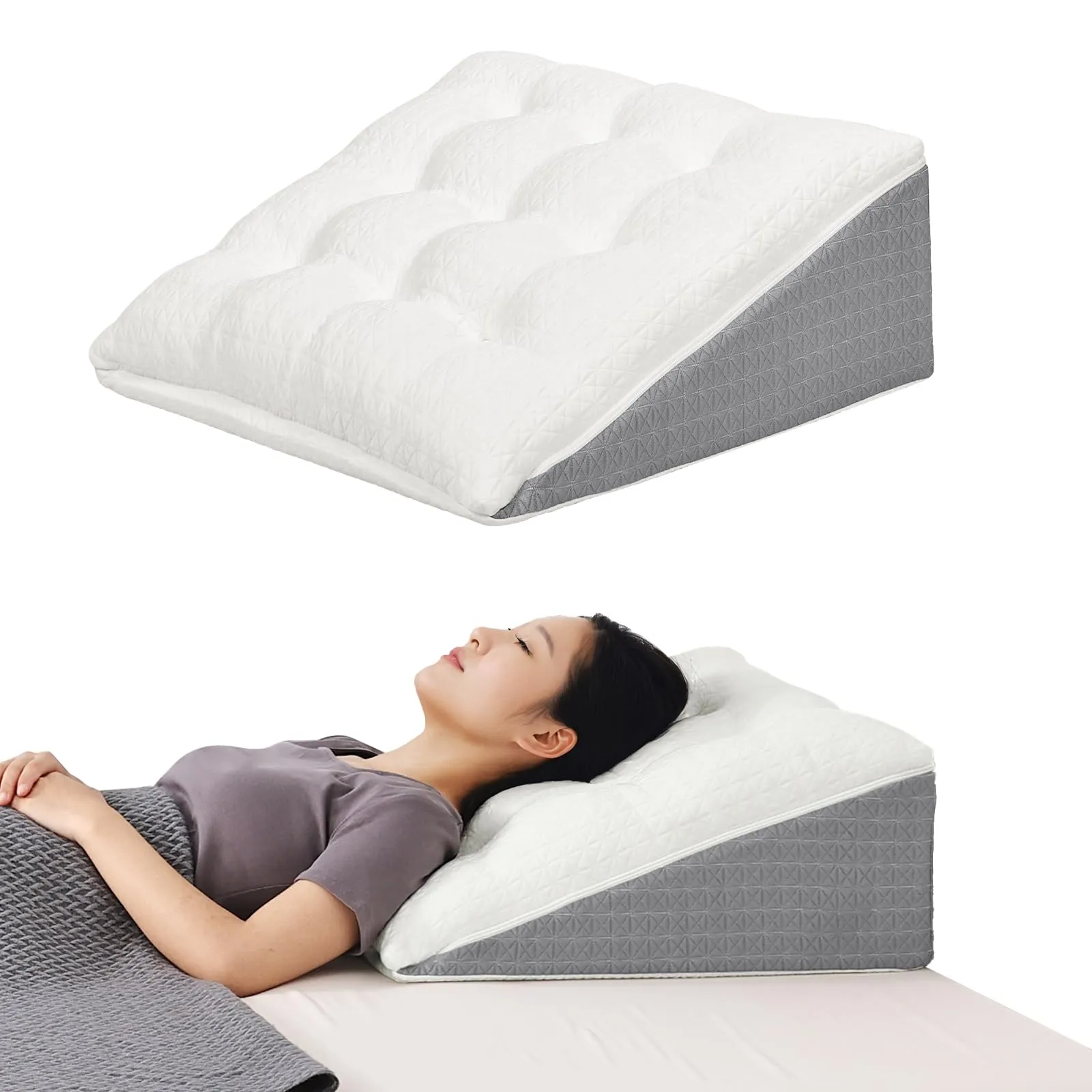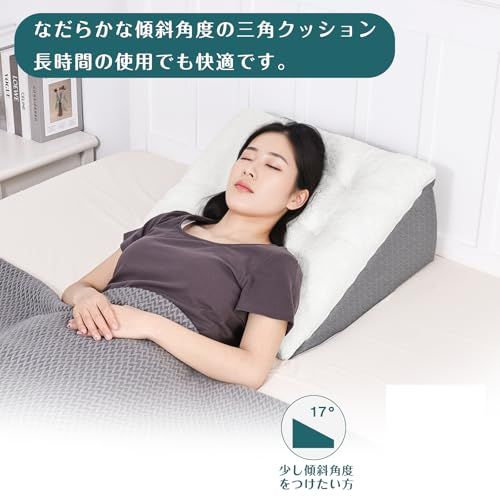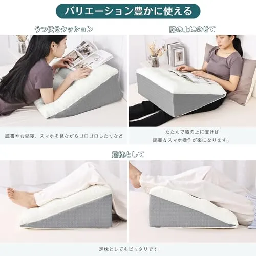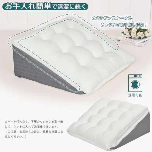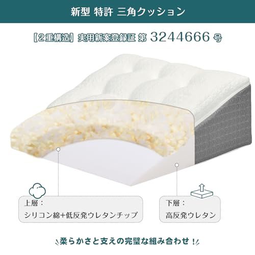 【特許取得済み2重構造】この新型三角クッションは、特許取得済みの2層構造(実用新案登録証 第3244666号)を採用しています。上層にはシリコン綿と低反発ウレタンチップを使用し、下層には密度25Dの高反発ウレタンを使用しています。この組み合わせにより、柔らかさと支えを完璧に両立させています。