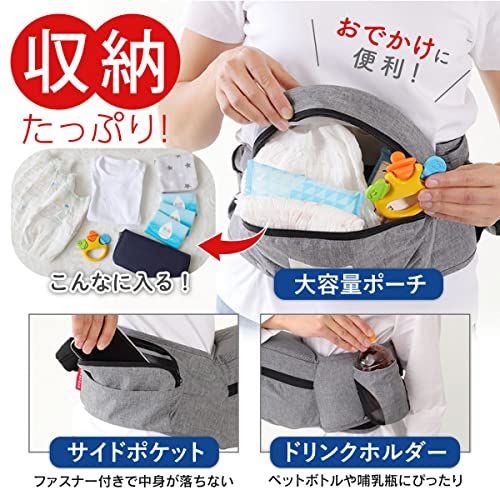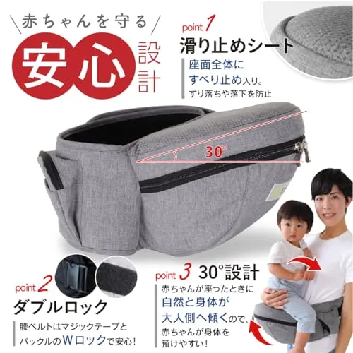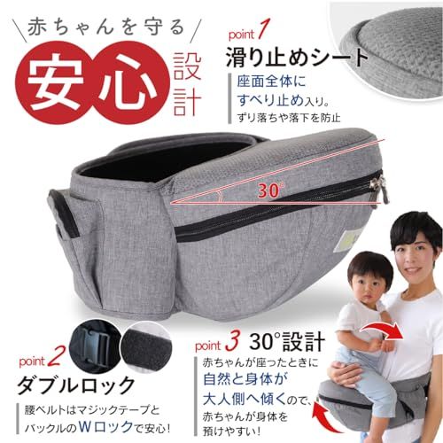 【ママ&パパと赤ちゃんに優しい安心&快適構造】《その?シート全面に滑り止め》赤ちゃんが座るシート部には全面に滑り止めが縫い付けられているので、赤ちゃんが動いても滑らず安心です。《その?2重で固定する腰ベルト》腰ベルトはマジックテープでベルトを固定した後にバックルを留め、固定します。2重でしっかり固定されるので安心です。